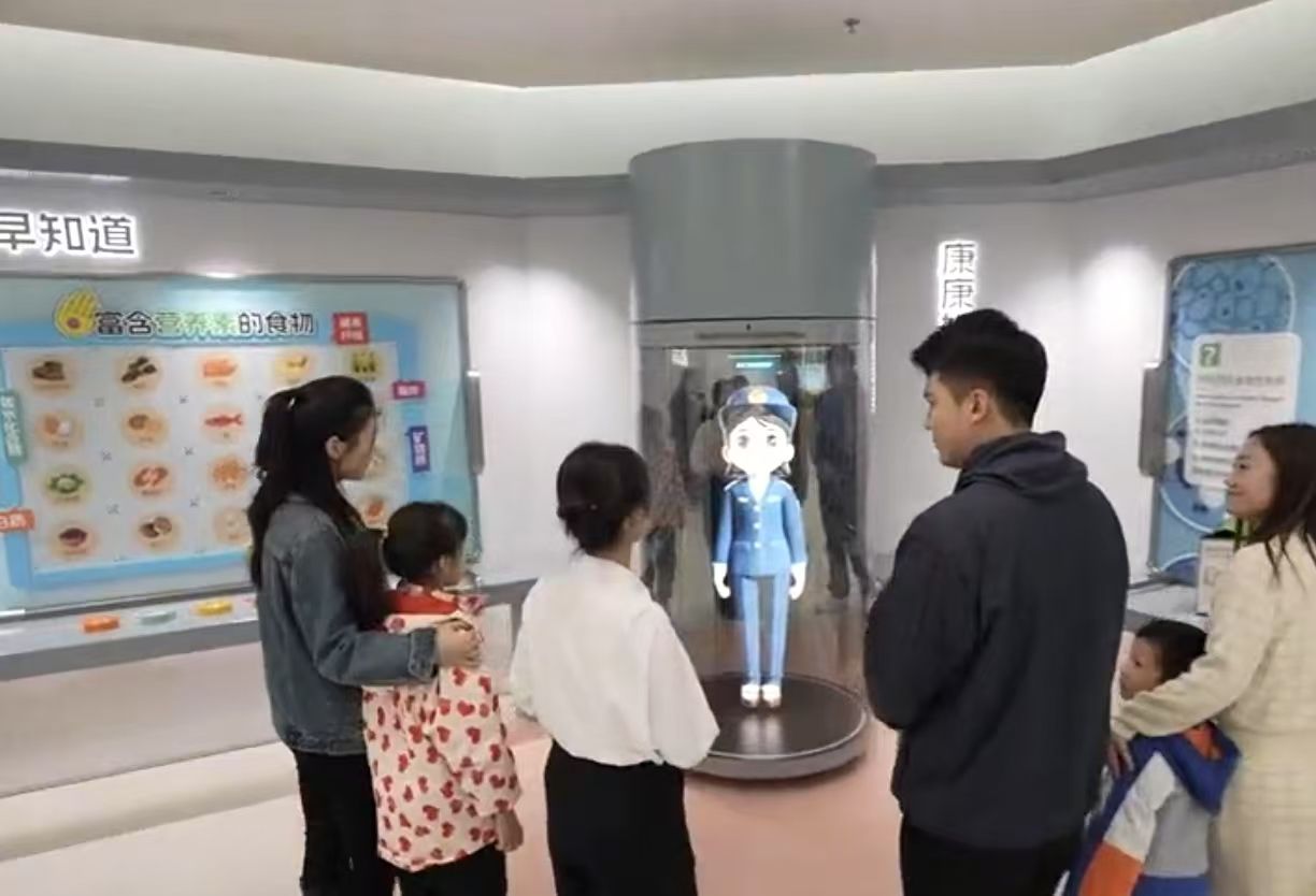 “城市观察团”成员与“康康姐”互动。武汉食品安全科普基地展馆 供图