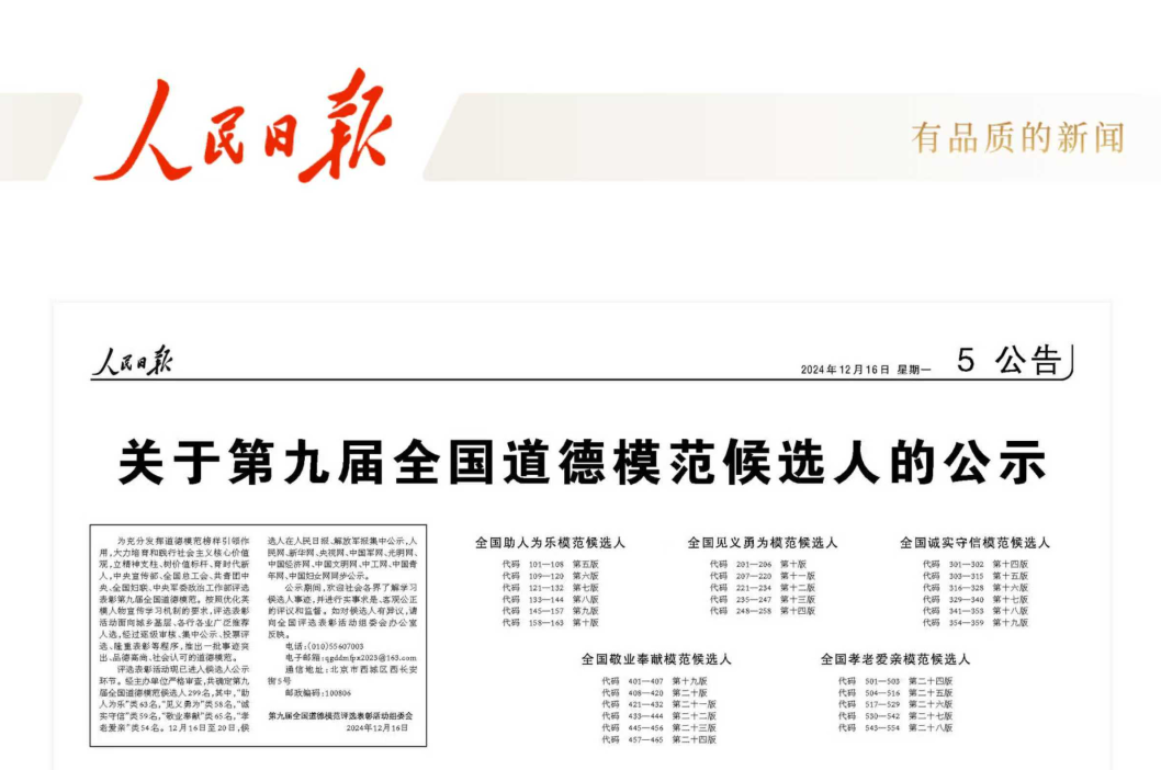 12月16日,《人民日报》刊发《关于第九届全国道德模范候选人的公示》,共确定第九届全国道德模范候选人299名,其中,“助人为乐”类63名,“见义勇为”类58名,“诚实守信”类59名,“敬业奉献”类65名,“孝老爱亲”类54名。