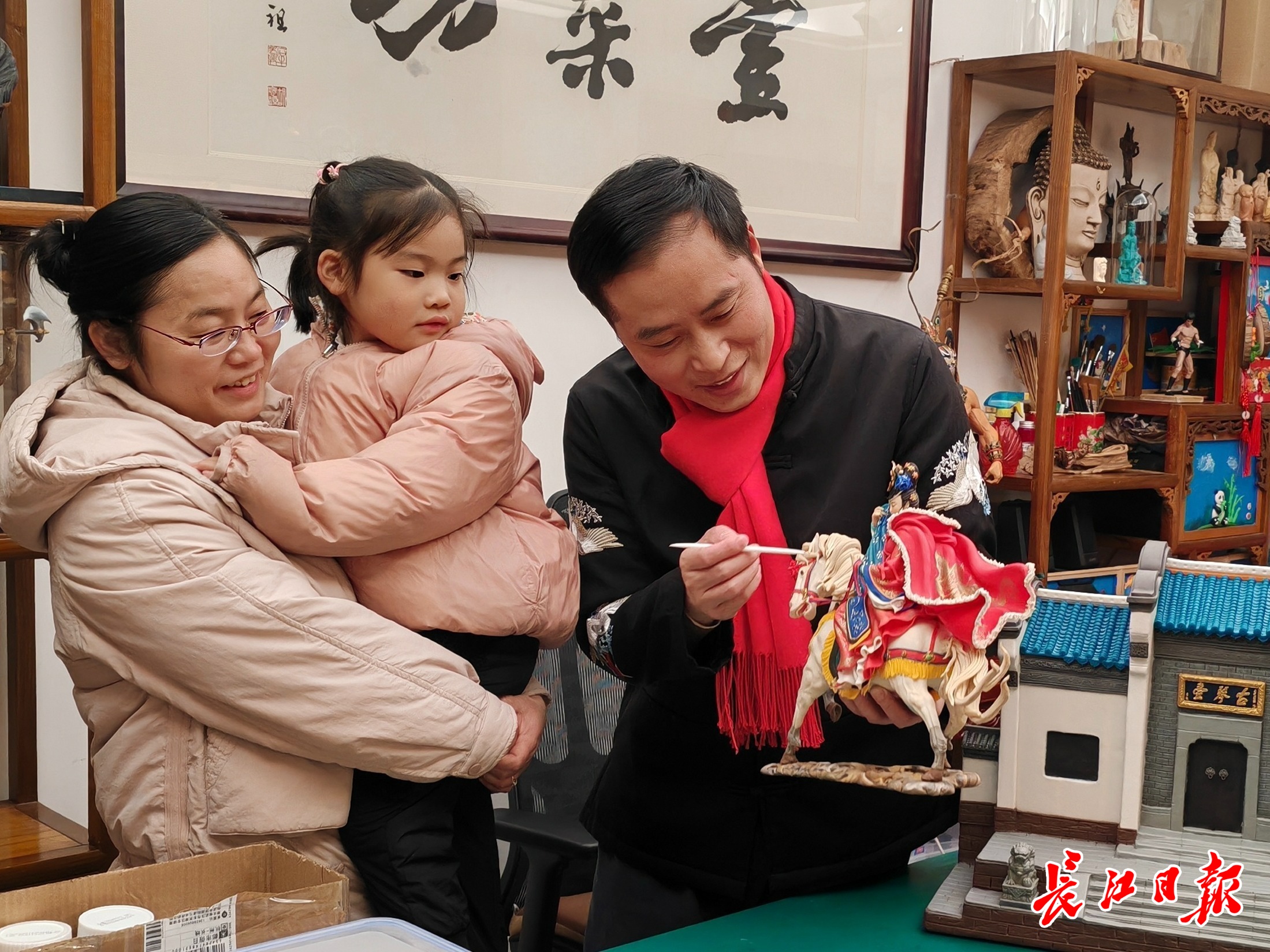 刘洁为妻子黄贺、小女儿介绍新作品。长江日报记者 张衡 摄