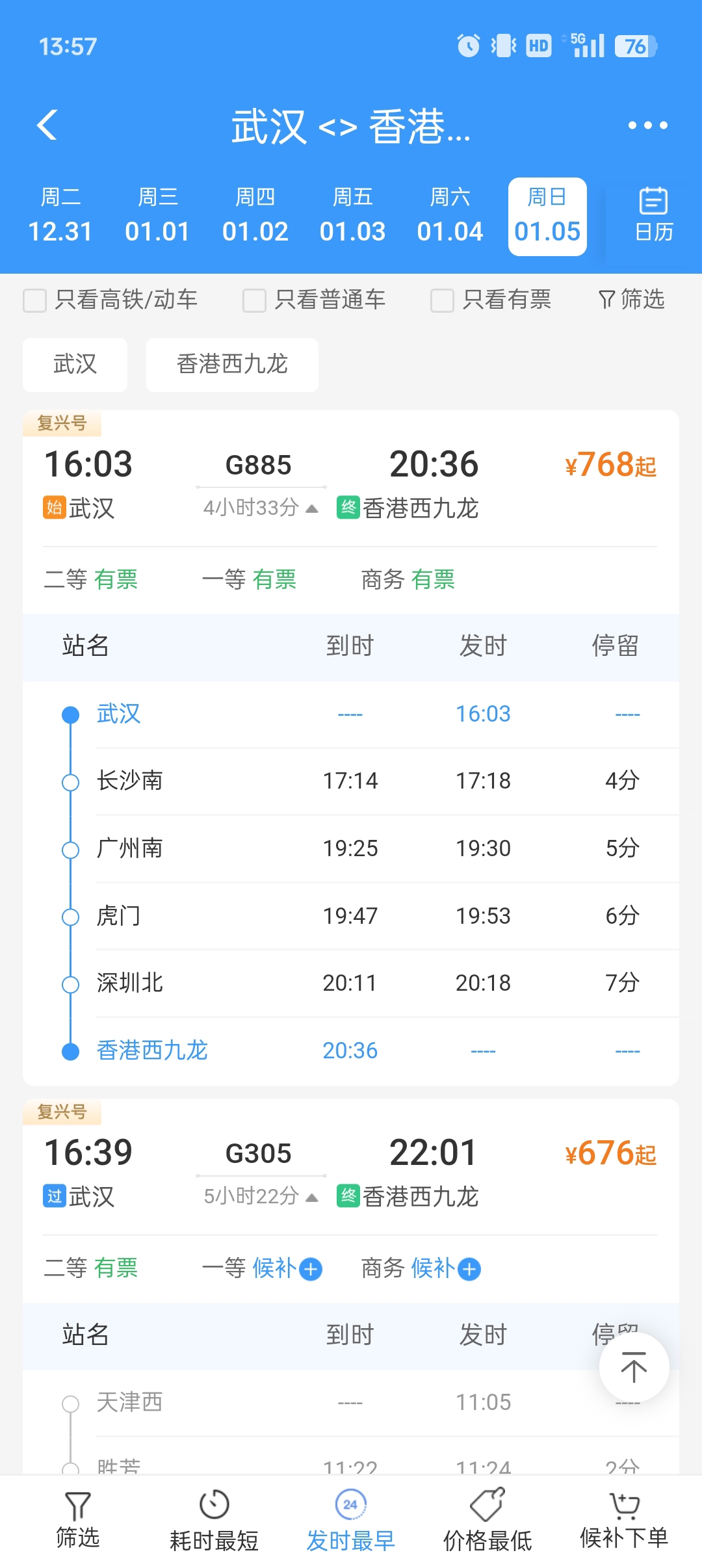 1月5日调图后,武汉前往香港将增至4个车次,除现有2个车次外,新增西安北始发途经武汉终到香港西九龙的G825次和武汉始发终到香港西九龙的G885次,用时4小时33分。