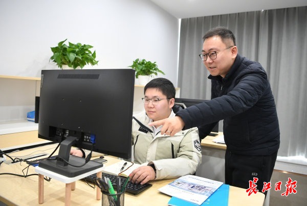 周昉(右)与同事在商讨工作、协调资源。 长江日报记者高勇 摄