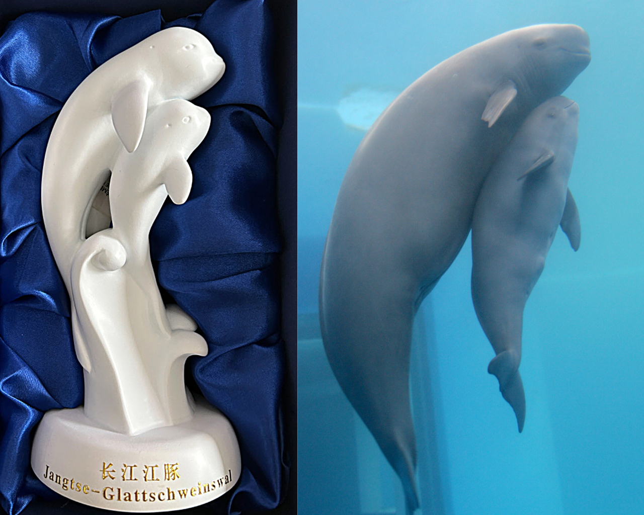 以世界首头人工繁育长江江豚淘淘母子温馨瞬间的照片为原型设计的“来自江城武汉的微笑”——长江江豚IP雕塑。
