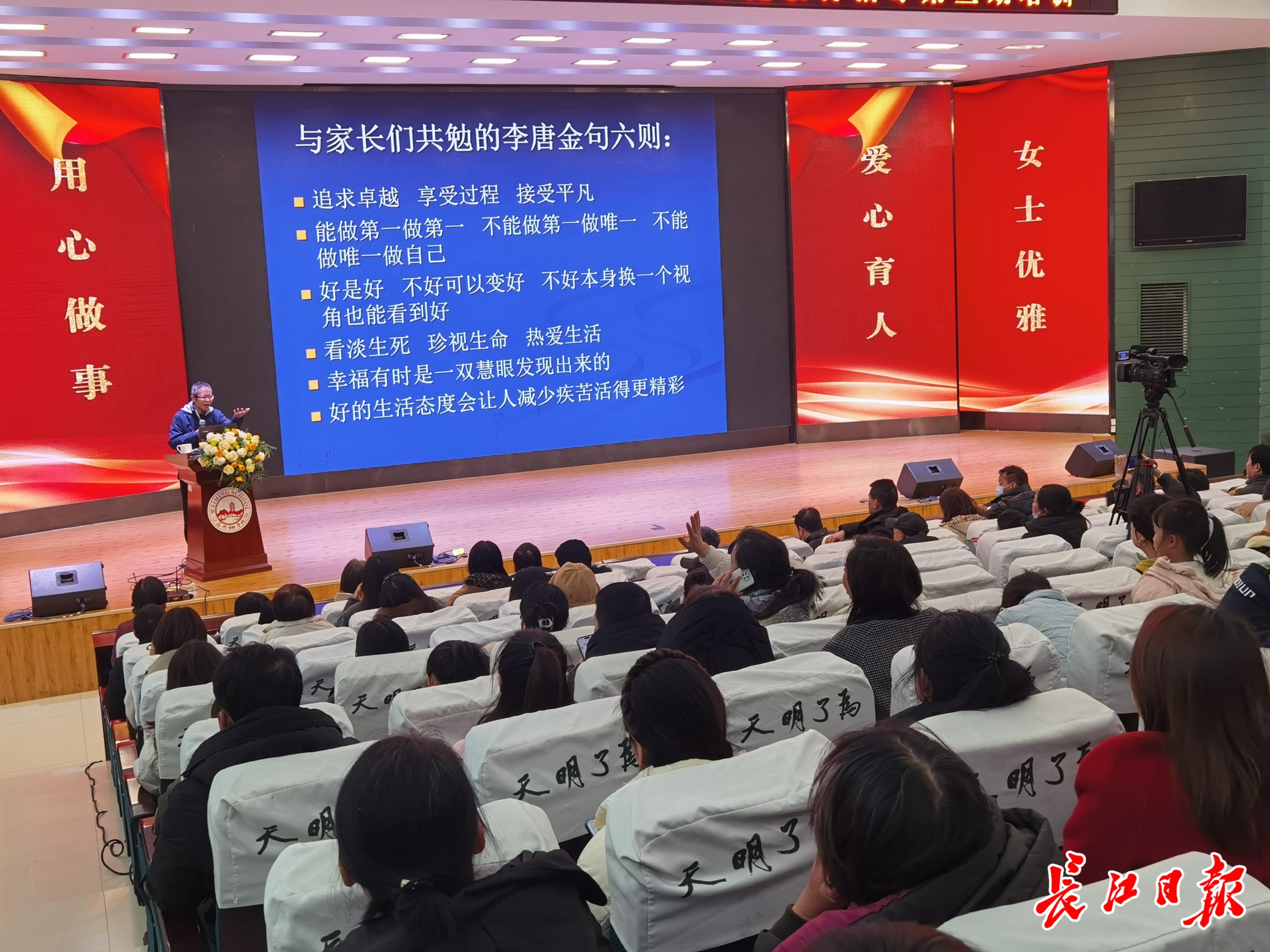 “(孩子)能做第一做第一,不能做第一做唯一,不能做唯一做自己。”12月21日,一场主题为“家长与孩子一起成长”的家校培训在武汉为明学校举行,带麻城口音的主讲人彭礼堂以自己的幽默风趣让现场气氛很快活跃起来。“(成绩)好是好,不好可以变好,不好本身换一个视角也能看到好。就拿我来说,身材不高节约了布料,人也不帅,不易引起别人注意,可以安心工作。”
