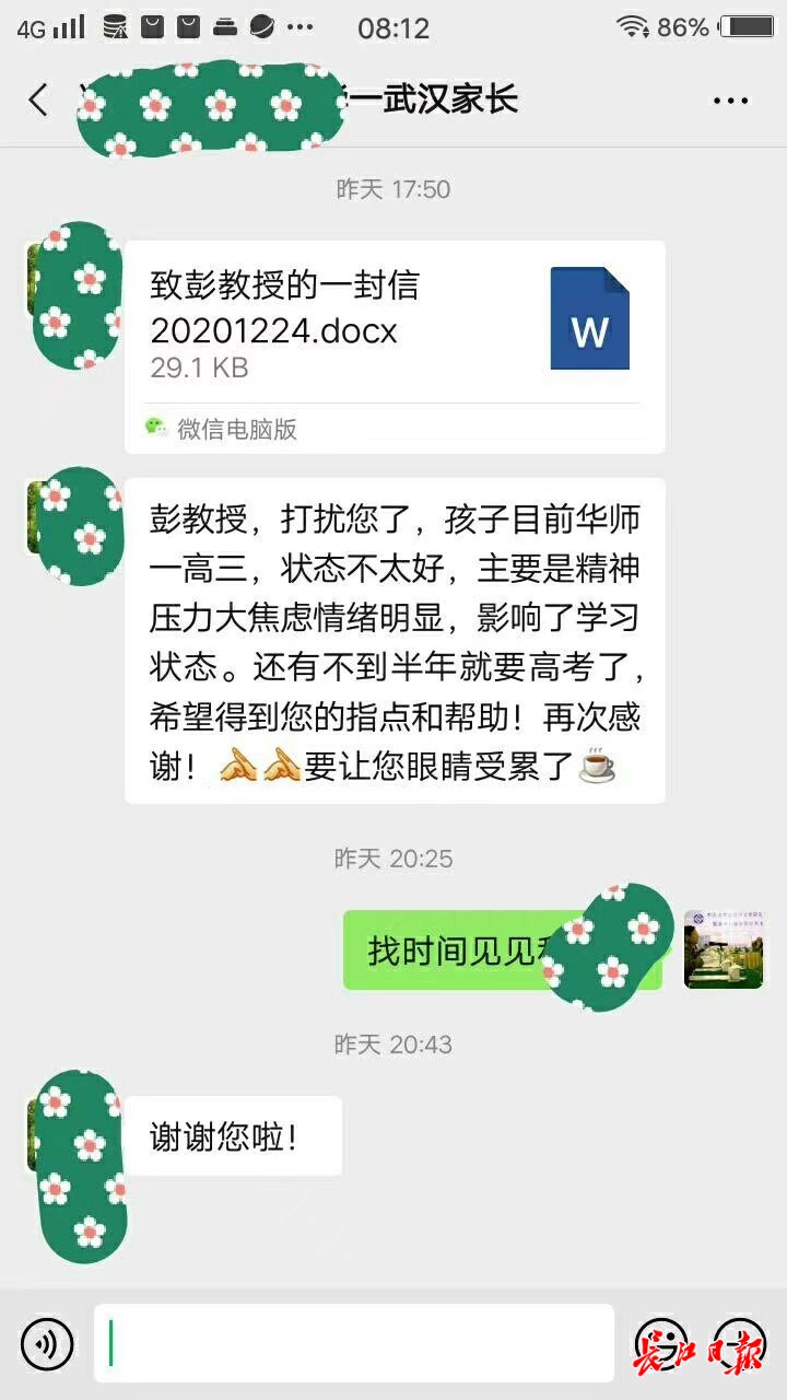 “孩子突然不想去上学,请彭教授救救我的伢!”12月7日中午,新洲一高中家长来电求助,说正常上学的儿子童童(化名)突然就死活不愿去上学,让他们措手不及,不知道怎么办。彭礼堂了解完实际情况后,和夫人章健一起驱车直奔新洲与童童见面。见到曾经给自己上过励志课的“彭爸爸”,童童很快安静了下来,并答应和“彭爸爸”一起去登山。