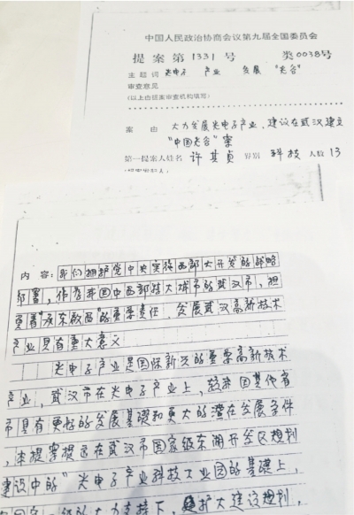 武汉市政协陈列馆保存着一份手写提案复印件。这是在2000年3月召开的全国政协九届三次会议上,许其贞等13位住鄂全国政协委员提出的第1331号提案《大力发展光电子产业,建议在武汉建立“中国光谷”》。