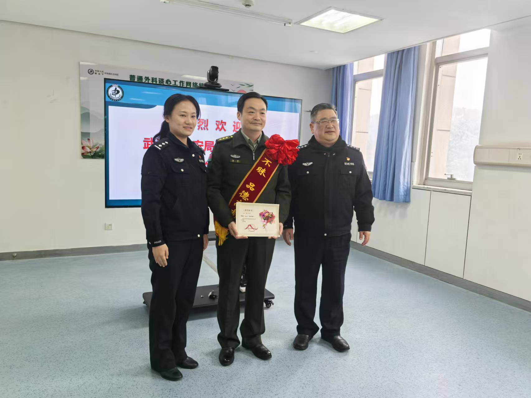 12月12日,市拾遗物品招领处工作人员专程来到中部战区总医院,为杨瑞医生颁发“拾金不昧”表彰证书,并佩戴了“拾金不昧”绶带。通讯员武龚萱 摄
