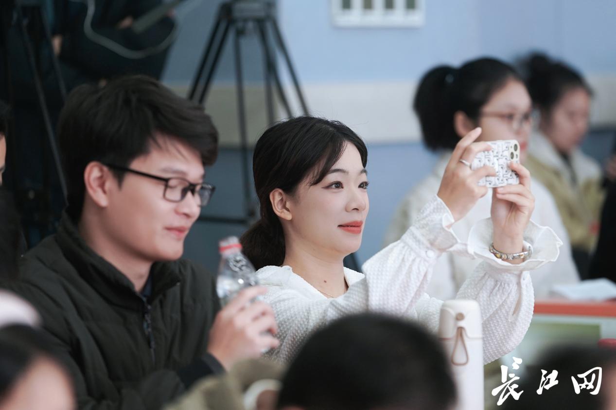 12月27日,在华中科技大学举办的长江网•长江头条“行走的大思政课”2024全国大学生社会实践成果交流会上,长江网“长江头条”原创MV《CHUANG》正式发布,在场大学生被欢快的旋律吸引。彭年 摄