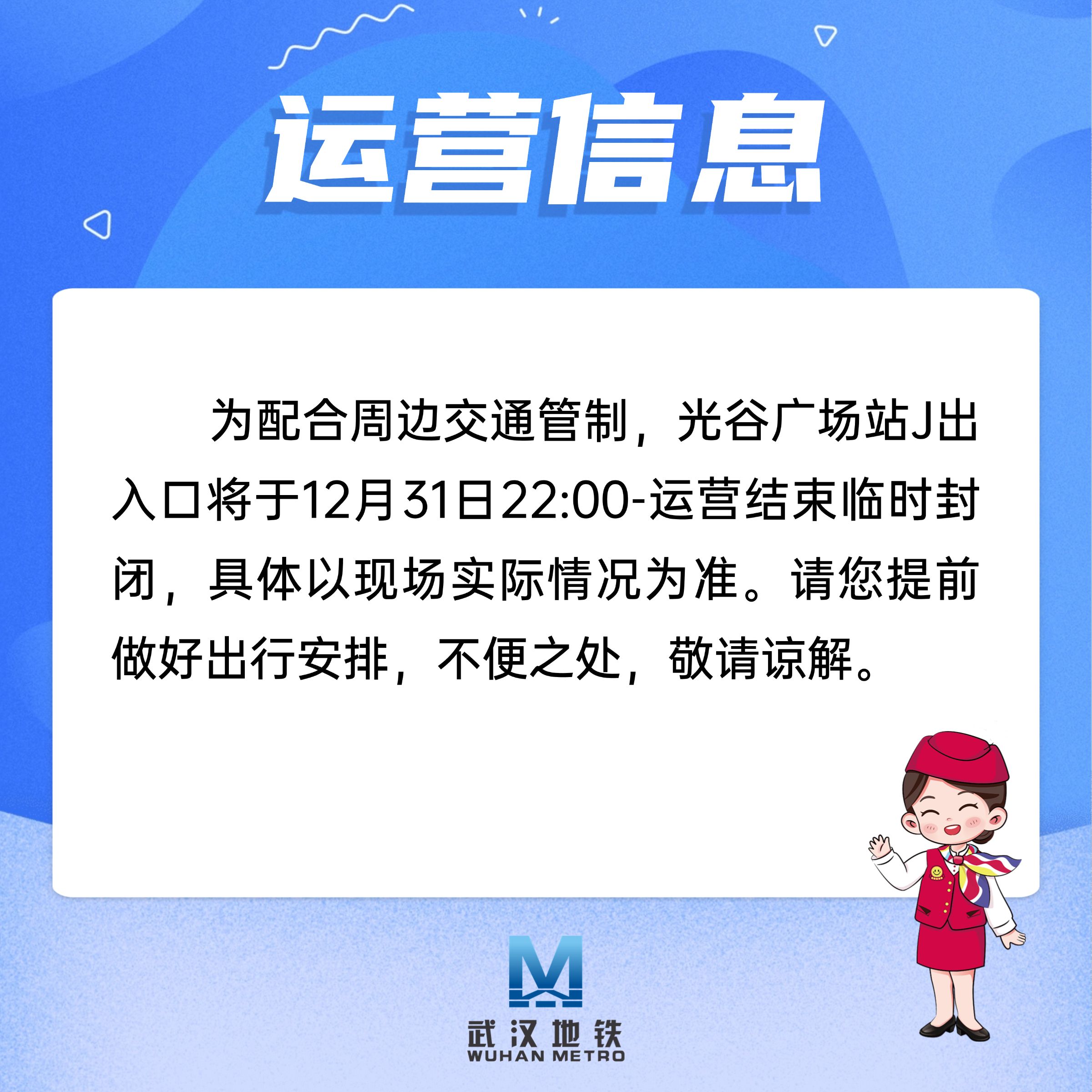 今晚,光谷广场站J出入口临时封闭 ©原创 2024-12-31 12:02 0 长江日报大武汉客户端12月31日讯(记者陶常宁 通讯员产启斗)为配合周边交通管制,光谷广场站J出入口将于12月31日22:00—运营结束临时封闭,具体以现场实际情况为准。请市民提前做好出行安排,不便之处,敬请谅解。 【编辑:姚昊】