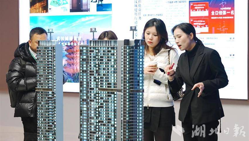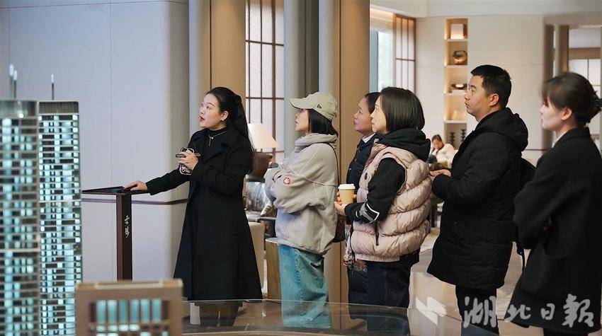武汉城建·中央雲璟营销中心,置业顾问正在为购房者介绍项目情况。(图片由受访者提供)