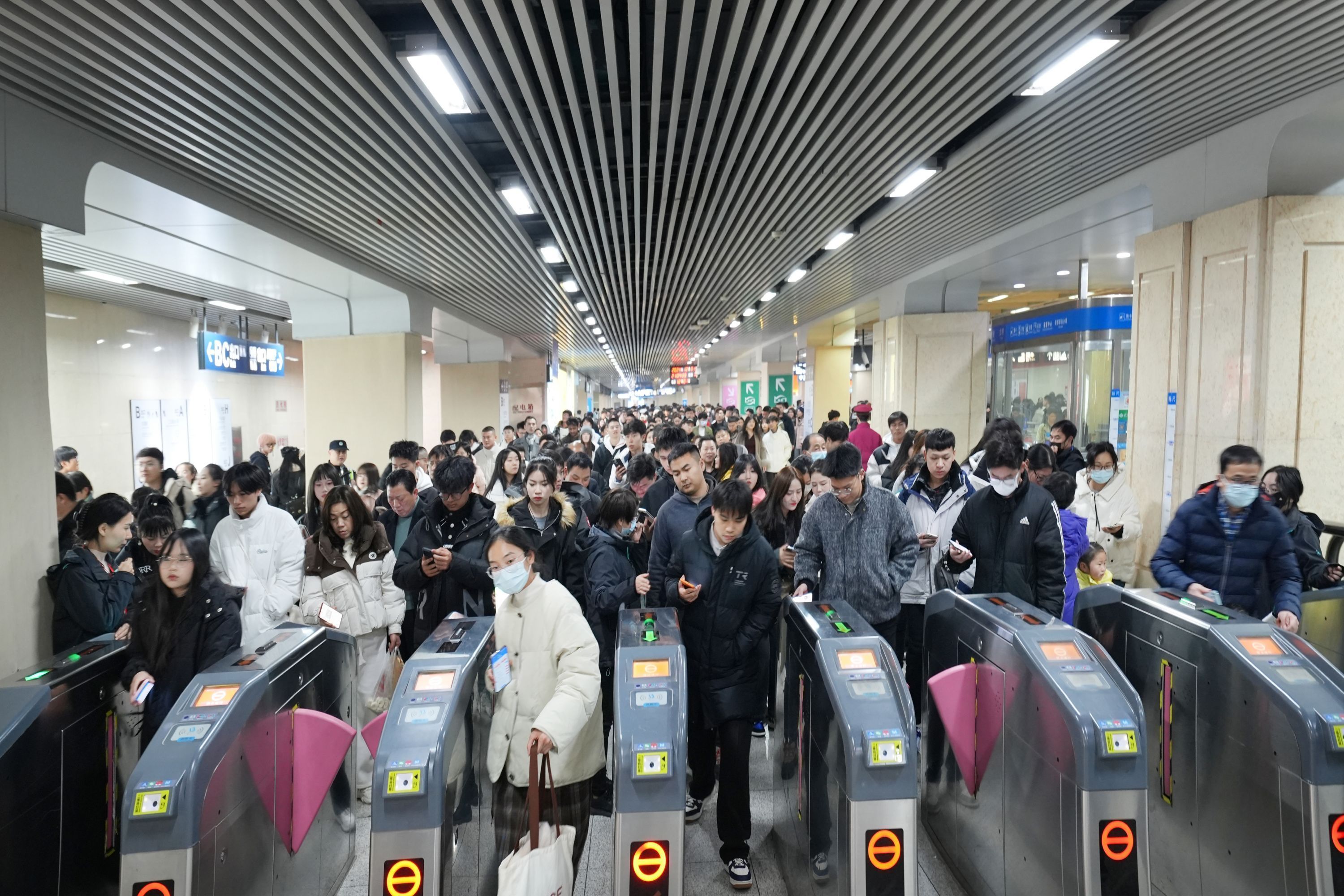 跨年夜,江汉路站大客流期间,乘客有序进出站。