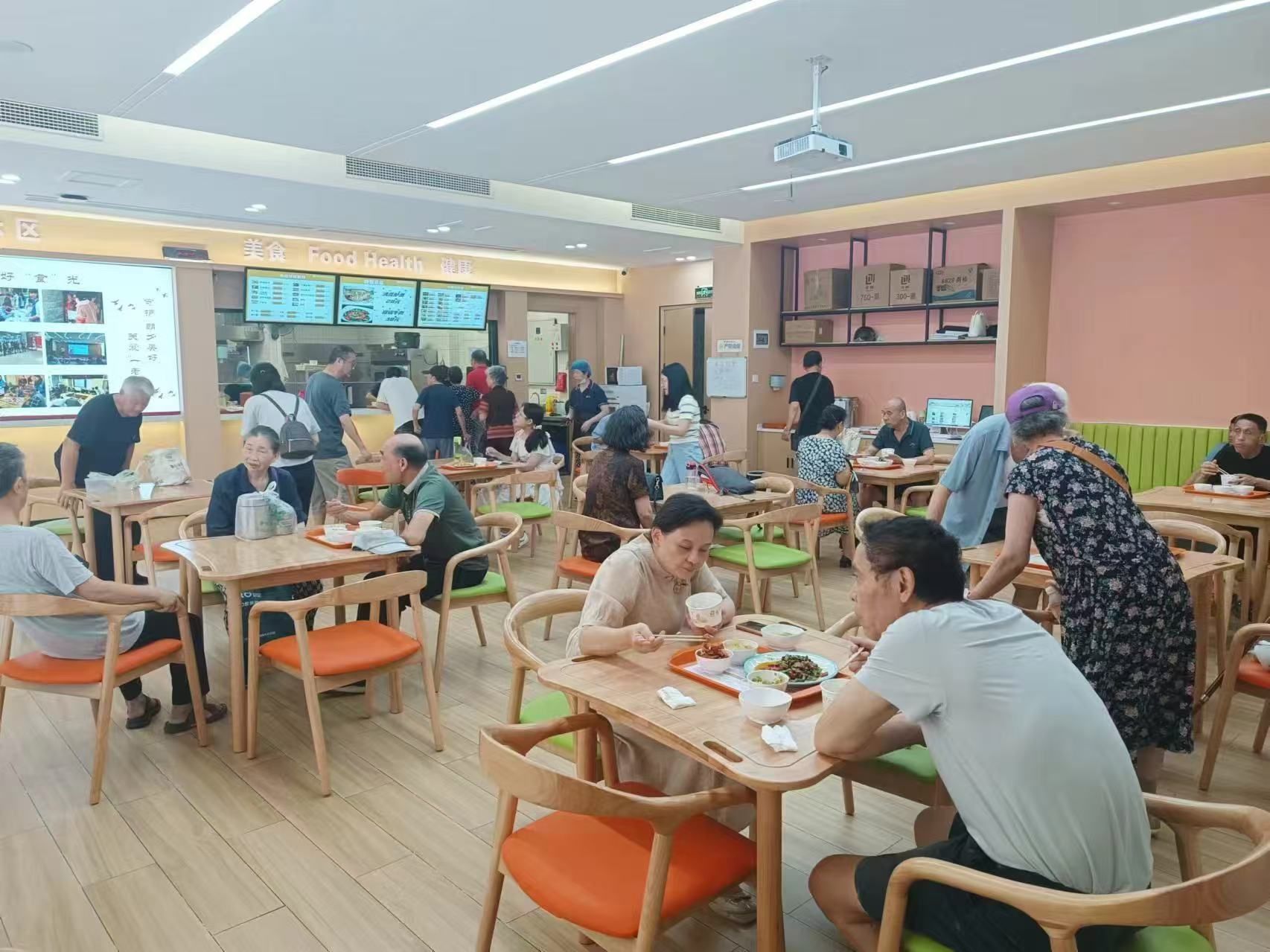 午餐时间,华锦社区食堂内吃饭的居民们。