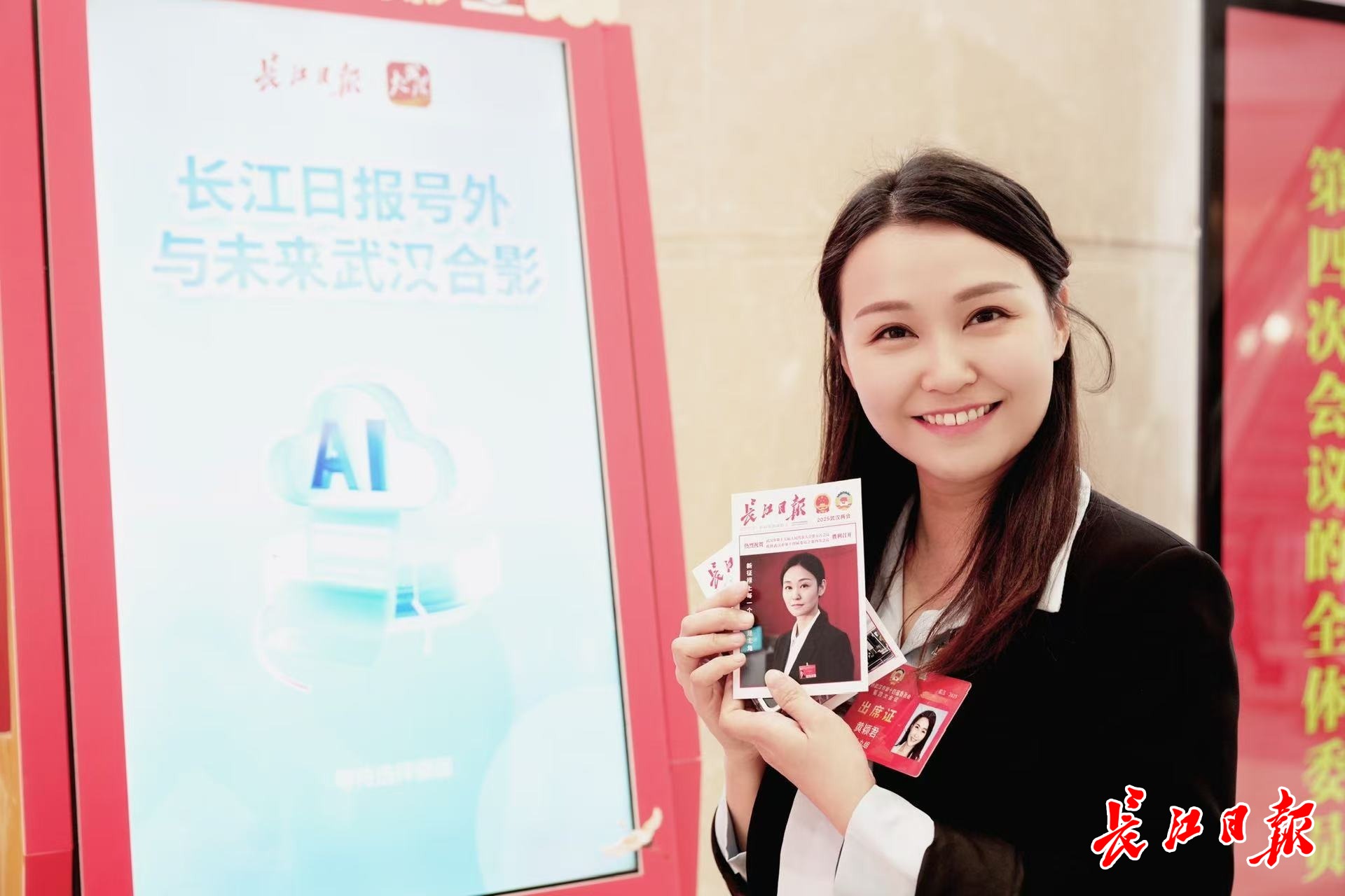 会场上,长江日报AI互动体验区吸引不少代表委员驻足体验。扫描屏幕二维码,拿起手机自拍一张,选择履职场景,“现场感”十足的照片即刻生成,选择打印,一张A5大小的精美照片就呈现在眼前。
