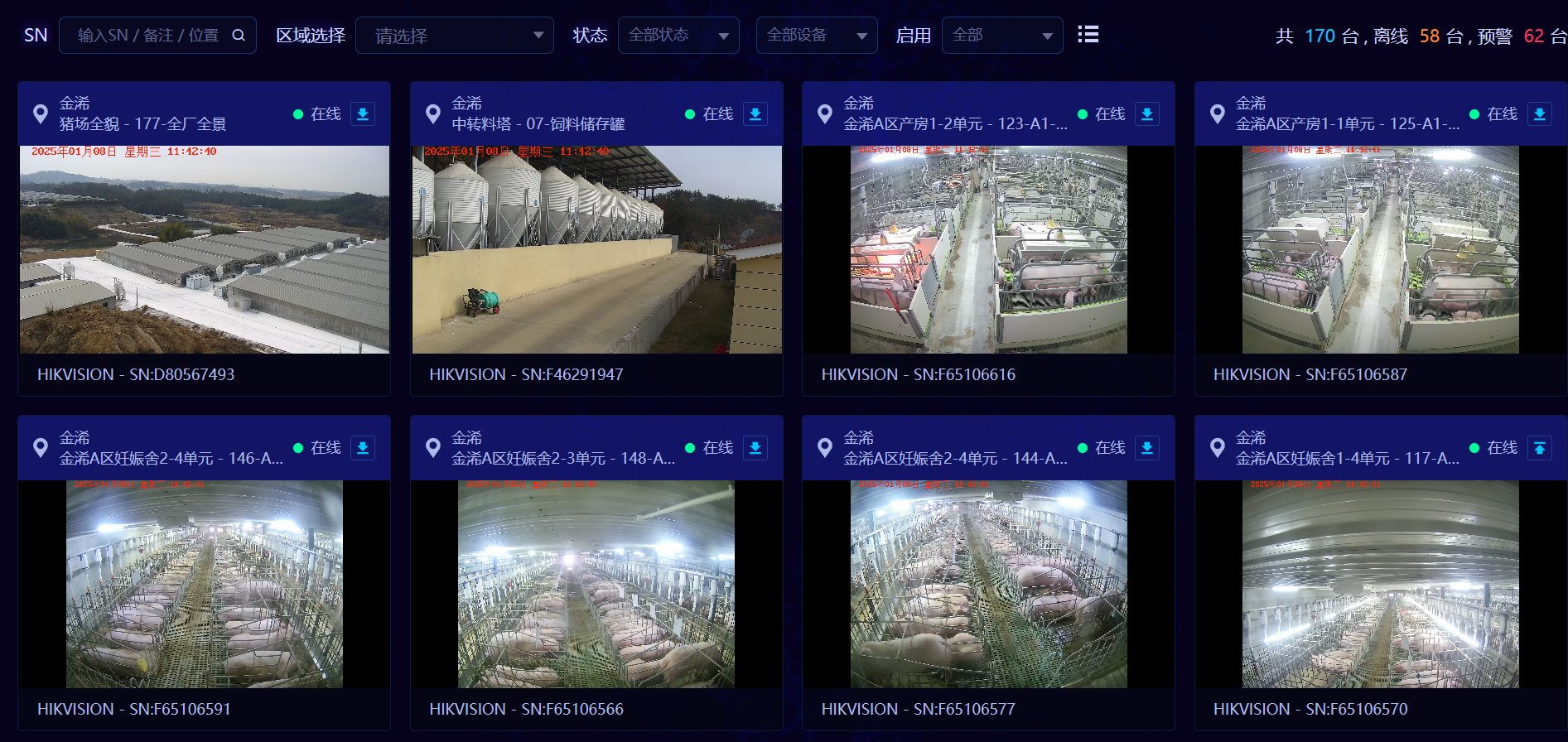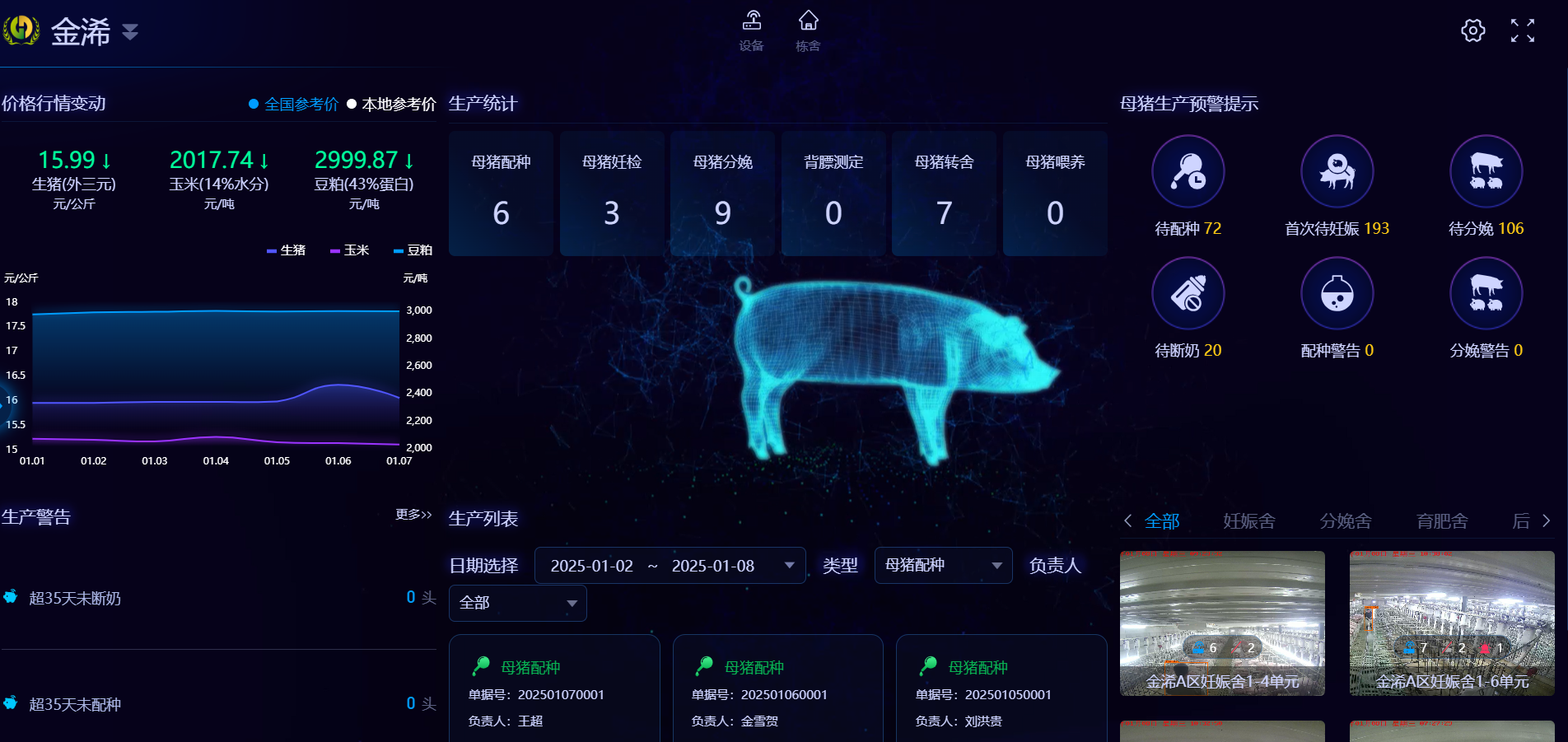 金龙公司数字化养殖系统智慧大屏,每头猪的详细生长信息和养殖实况24小时在线。
