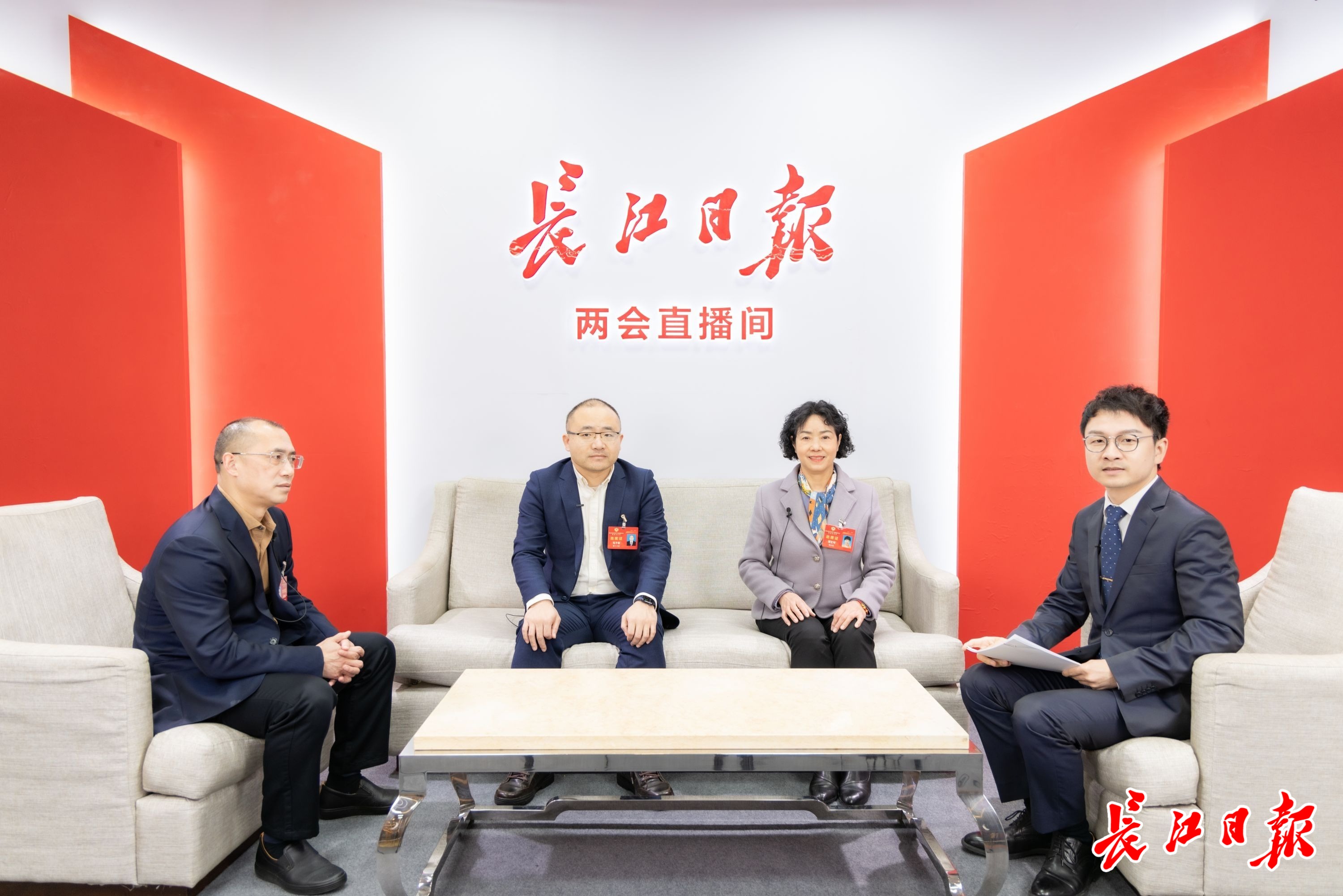 市人大代表高思诚(左一)和市政协委员毛子骏(左二)、谭艺琴(左三)做客长江日报“两会直播间”。 孙大卫 摄