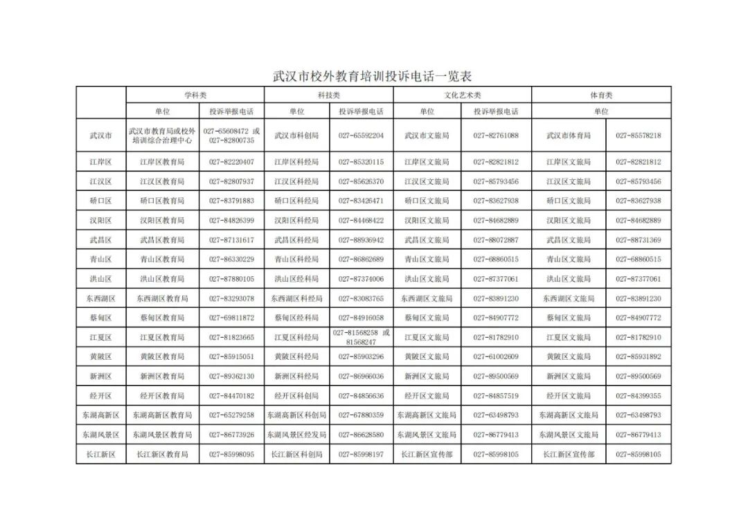 三、监督举报违规培训。如果您发现违规培训,欢迎拨打各区主管部门投诉电话进行线索反馈或举报。市区校外教育培训投诉电话详见本网关于《武汉市校外教育培训投诉电话一览表》的公示信息。