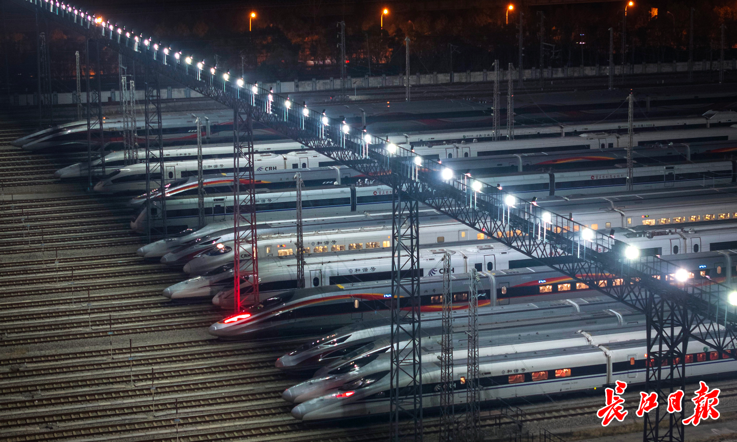 14日凌晨,武汉动车段,高铁列车整齐排列如“万箭齐发”。 记者史伟 摄