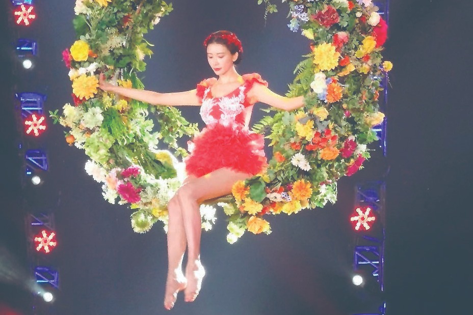 从天而降的巨大水幕,宛如一堵花墙,12人空中秋千亮相。林志玲在水幕中央乘着花环出场,纵身一跳,进入梦幻的水下世界,穿梭在象征着希望与和谐的“春之环”,与湖北省体育局花样游泳队、武汉汉秀艺术团等演员一起完成了水上芭蕾表演。