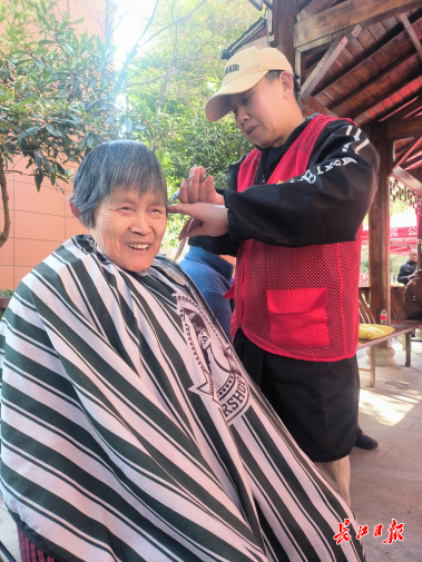 永利社区志愿者为居民免费理发。 记者冯雪 摄