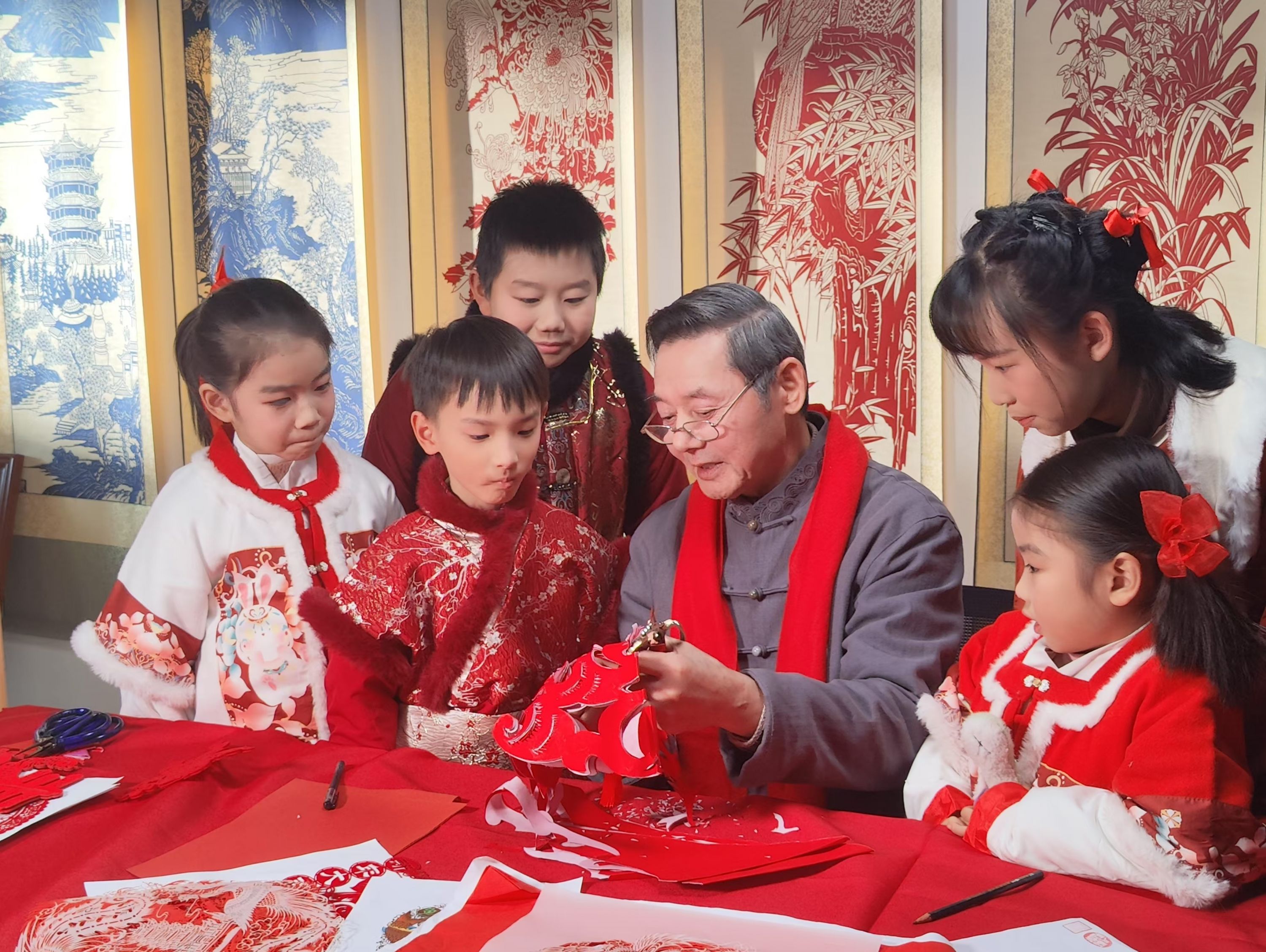 武汉剪纸省级非遗传承人沈松柏在自己工作室教来自武汉多个社区的小朋友学剪窗花。 记者万建辉 摄