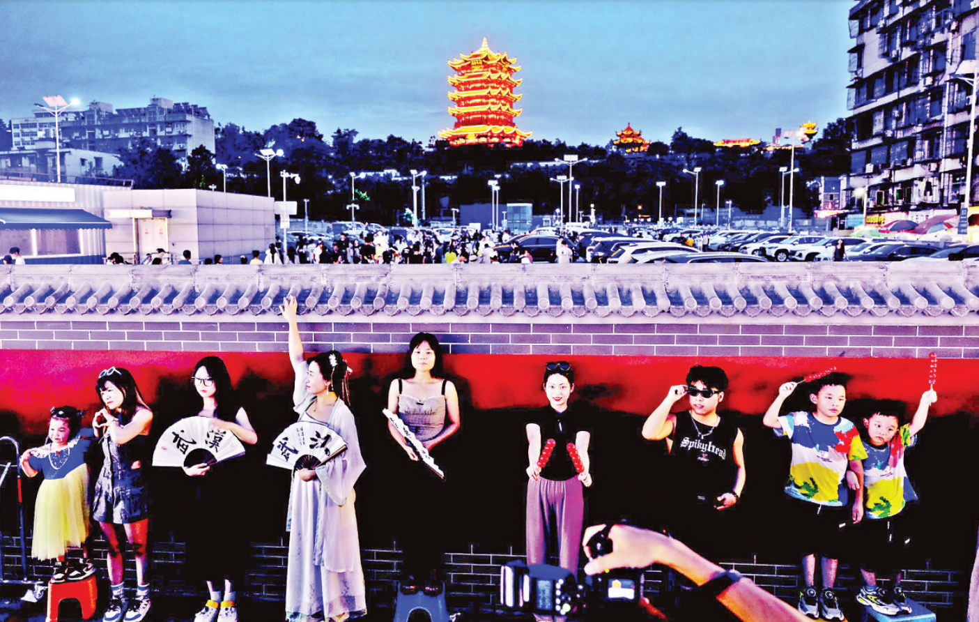 夏夜,年轻人在黄鹤楼前的红墙拍照留念。 长江日报记者胡冬冬 摄