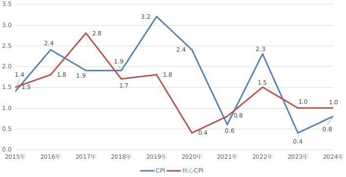 从全年趋势看,CPI呈现月环比低位波动、同比涨幅“前高后低”态势,其中,2月份涨幅为全年峰值(1.5%),3—6月份回落后小幅反弹,7—12月份,各月CPI逐月走低,12月涨幅0.4%。