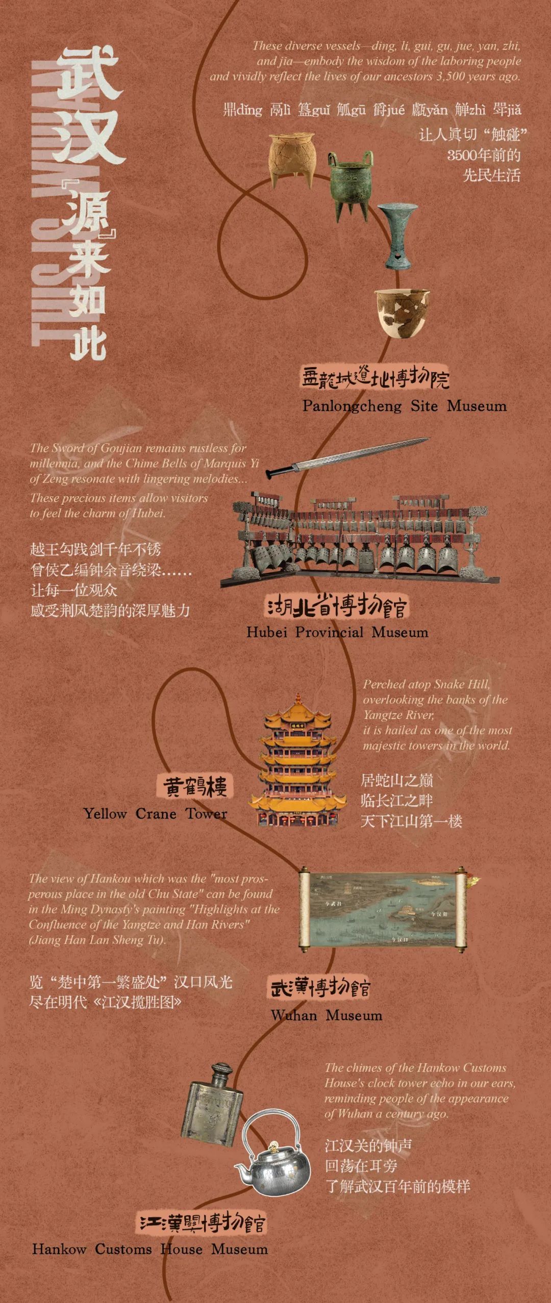 再把时间倒回到百年前,江面上船只林立,码头上各地口音夹杂着各国语言,空气中弥漫着茶叶的芳香,江汉关的钟声回荡在耳旁。滚滚长江、悠悠汉水,武汉的文化与底蕴,在遍布全城大大小小的博物馆里浓缩成了时光的宝藏,谱成了岁月的歌。