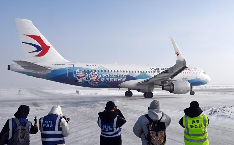 1月23日,东航MU5616航班“亚冬号”主题彩绘飞机在哈尔滨机场新建东二跑道上滑行准备起飞。新华社发(刘洋摄)