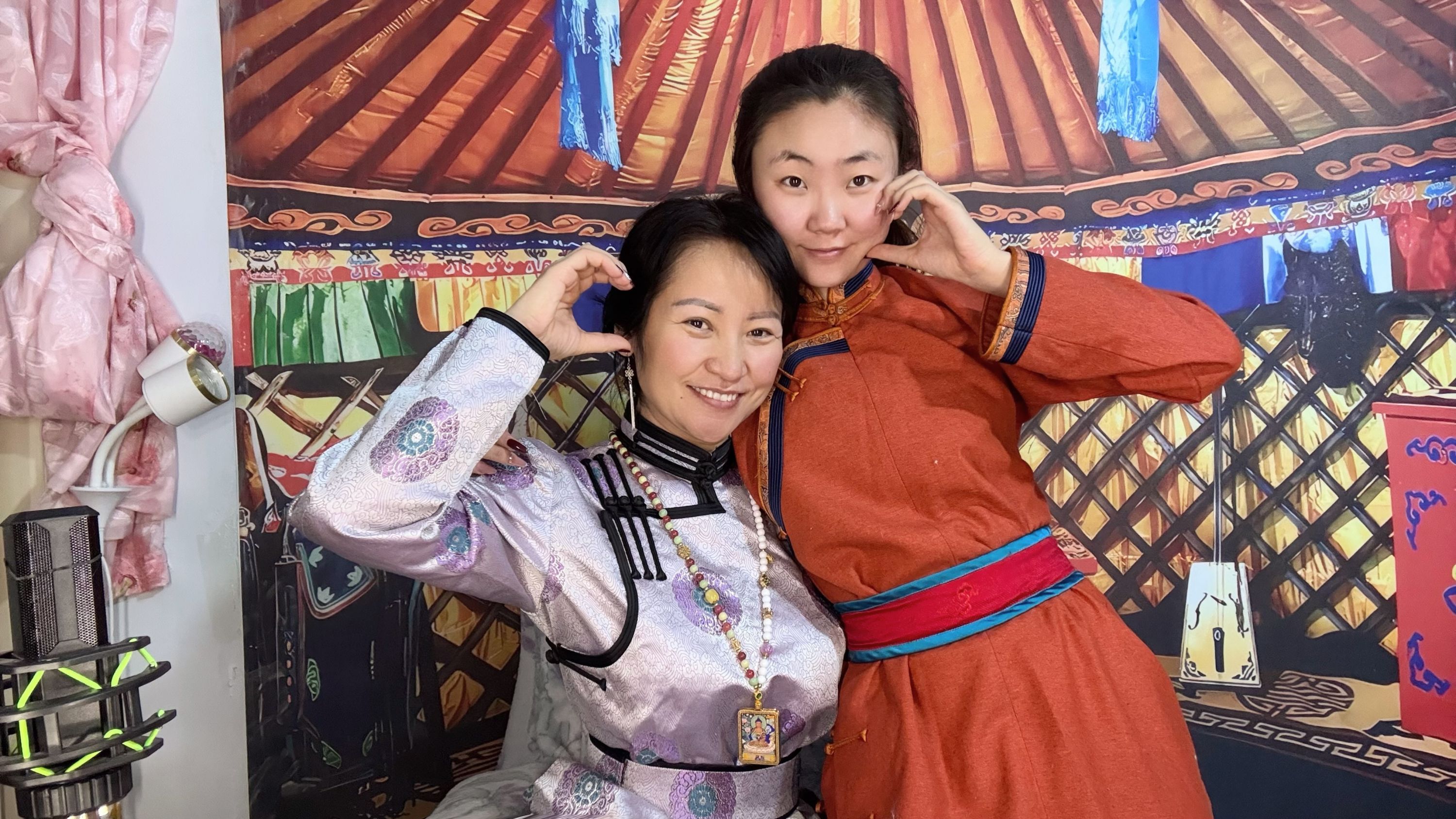 渠雨轩和妈妈身着蒙古袍,在家中亲密合影。