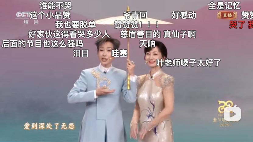 为了应“蛇”这个生肖,春晚邀请到赵雅芝和叶童——经典的“白娘子”和“许仙”。《借伞》结合京剧、粤剧、川剧、越剧四个剧种的表演方式,围绕“断桥借伞”演绎了一段故事。当赵雅芝和叶童登场,再现30年前《新白娘子传奇》中的经典一幕,一些网友直呼:“奶奶,你嗑的CP同框了!”
