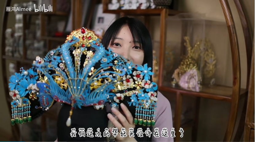 她们身上所戴的配饰由B站的UP主@雁鸿Aimee和@慕容意的手工小记制成,结合了掐丝珐琅、剪纸、皮影、绒花、缠花等七种“非遗”技艺或元素。