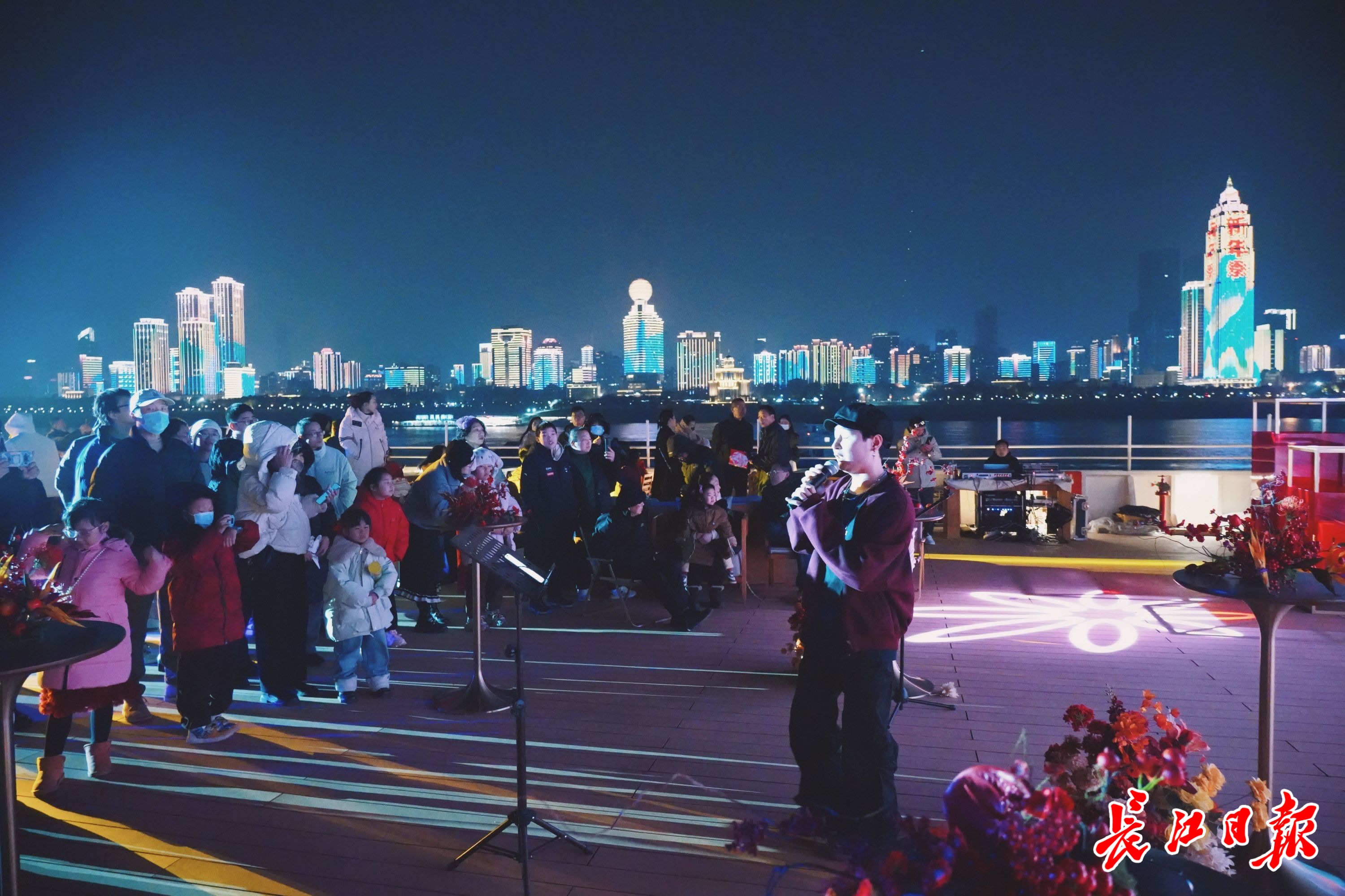 夜幕降临,华灯初上,“古琴号”缓缓起航。江水悠悠流淌,两岸风光如画,“古琴号”甲板现场音乐演出点燃新春夜。市民游客在甲板各处欣赏两岸璀璨楼宇,随着音乐一起摇摆。从浙江来武汉游玩的李先生感慨道:“看春晚的时候就被武汉两江夜色深深吸引。这次来武汉,专门登上‘古琴号’,听着音乐赏江景,感觉春晚的热闹还在延续。”当“古琴号”穿越长江二桥时,他拿起手机与外地亲友视频分享美好喜悦。