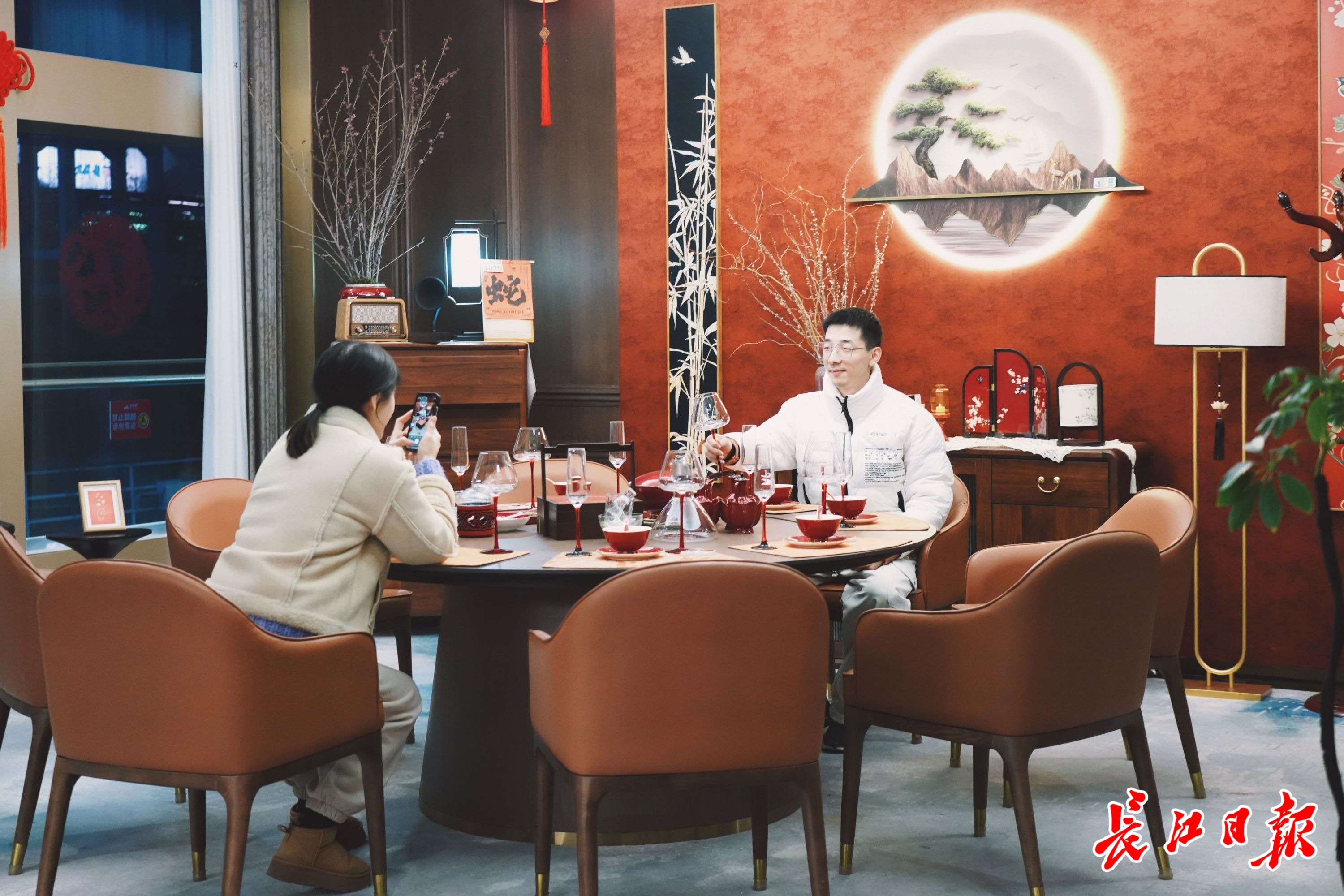 “昨天看完春晚,今天就特别想来‘古琴号’体验一下。”大年初一晚6时许,“古琴号”迎来复航后的第一批市民游客。一楼宴会厅新春国潮市集欢笑不断,现场主题布置以红色为主,蛇年造型的打卡装置精美多样,游客用手机记录下满满的新年氛围。两侧的互动摊位都排着长长的队伍,市民李毅波女士带着孩子在市集穿梭,一会儿体验年画拓印,紧接着排队等待制作漆扇。“在春节带孩子感受传统文化,很有意义。”