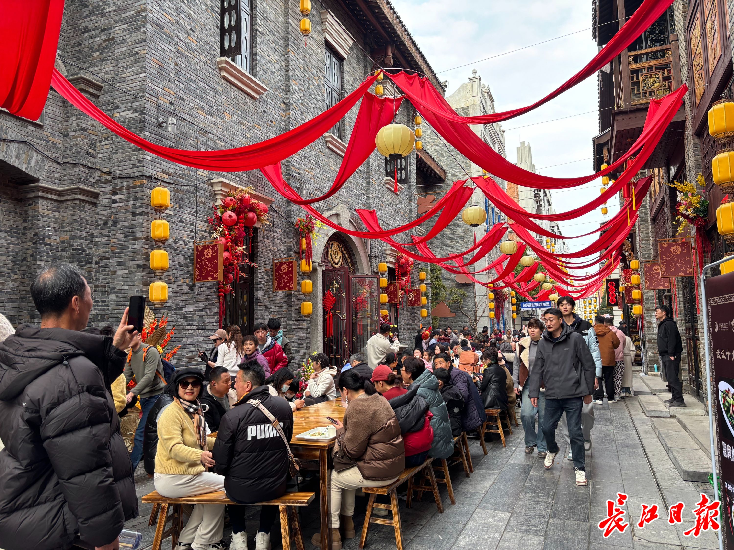 为了让广大游客打卡作为春晚取景地的“黄鹤楼、光谷星河广场、江汉路、吉庆街”,武汉文旅局策划了“跟着春晚游武汉”三大主题线路,覆盖武汉各大经典地标。一是赛博·科技之旅。游客乘全国首条全自动空轨,开启270°赛博观景。二是江湖·人文之旅。蛇年登蛇山,打卡春晚同款黄鹤楼、看编钟、越王勾践剑,感受历史名城风范、观江游湖,看璀璨灯光秀点亮两江四岸。三是烟火·美食之旅。在汉口历史风貌区开启松弛的城市漫步,在老字号扎堆的吉庆街,品尝地道汉味美食,在园博园看武汉最大花灯会,感受庙会浓浓烟火气。这几天,春晚武汉分会场长桌宴拍摄地汉口园博园-汉口里景区、人头攒动,众多游客纷纷在此打卡拍照。