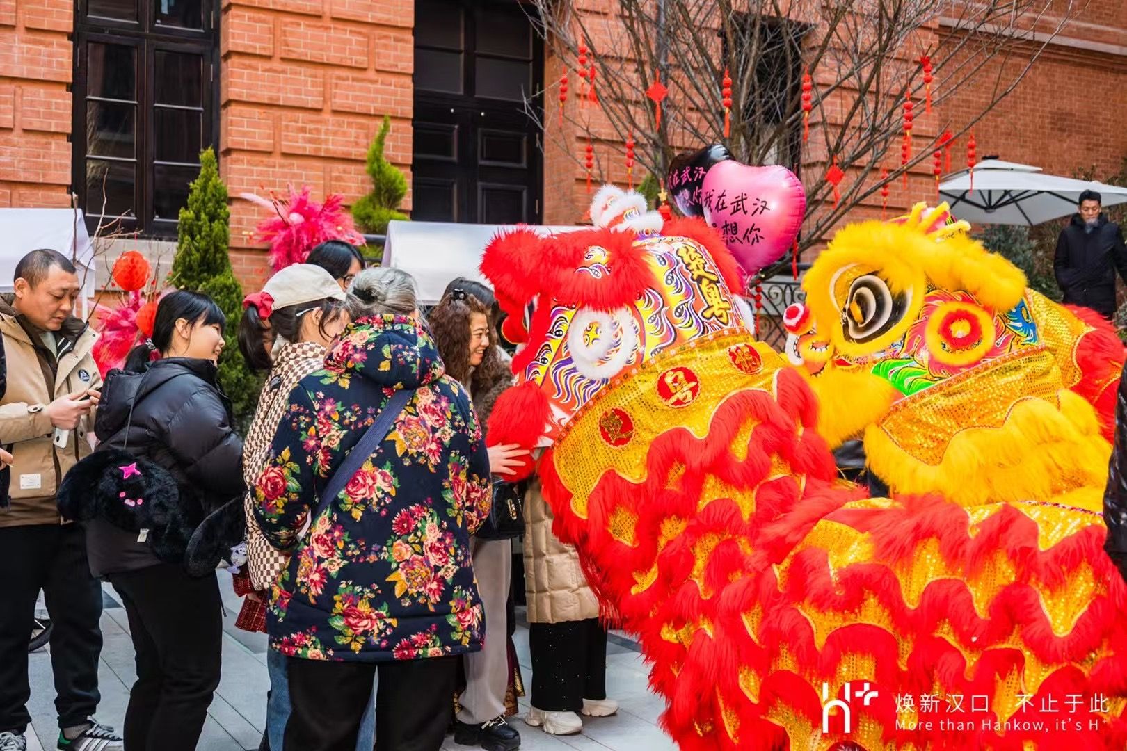 大年初一,武汉马哥孛罗酒店门口,舞龙舞狮吸引游客观看。