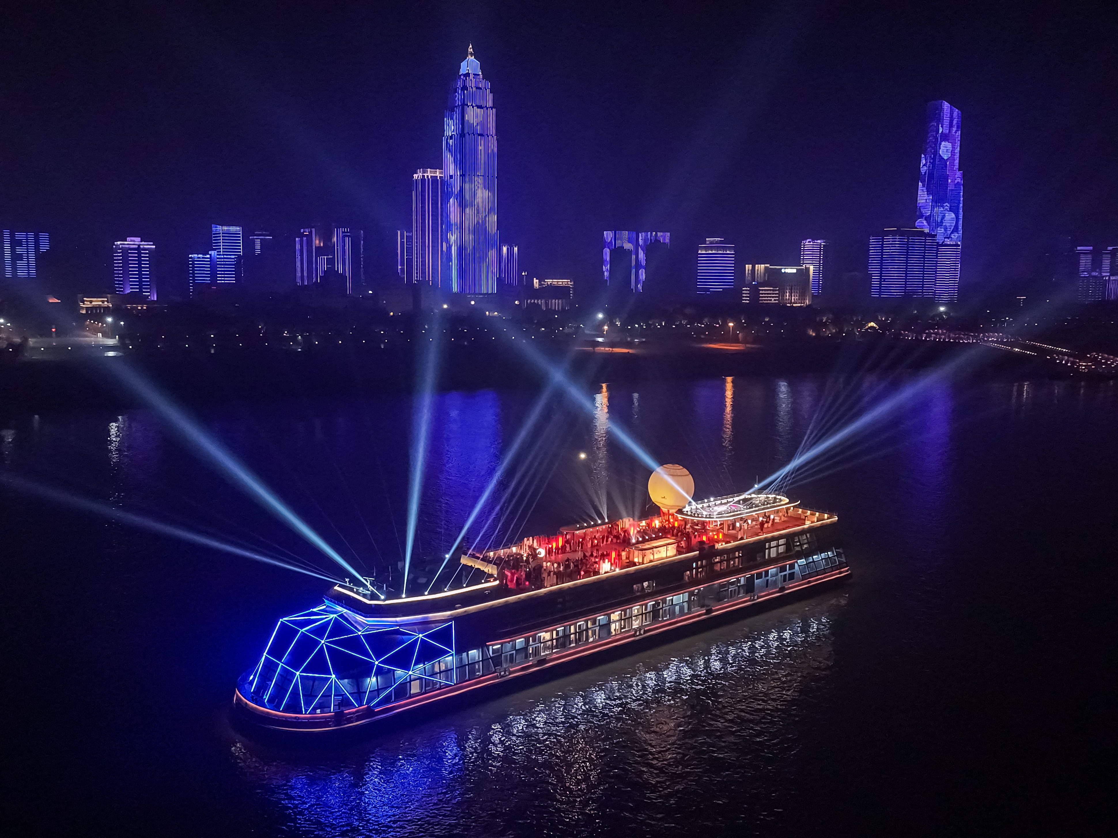 船在江中行、人在画中游、灯在楼上秀,江风拂面,万里长江第一屏尽收眼底——作为游览长江观看夜景的最佳体验方式之一,武汉文旅集团两江游览为游客准备了丰盛的文旅“大餐”,主题鲜明、氛围感拉满的一系列特色活动让游客们看得过瘾、游得尽兴。英雄岳飞“穿越”到“黄鹤楼号”游船,带领游客沉浸式体验沙场阅兵、感受岳飞“再续汉阳游”的豪迈;“李白号”游船上,沉浸式情景剧“李白和他的朋友”与海内外游客一同游长江、品诗词。
