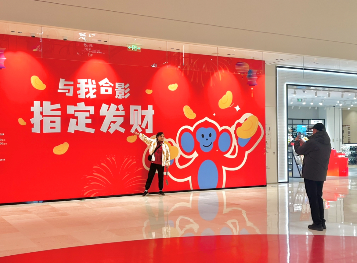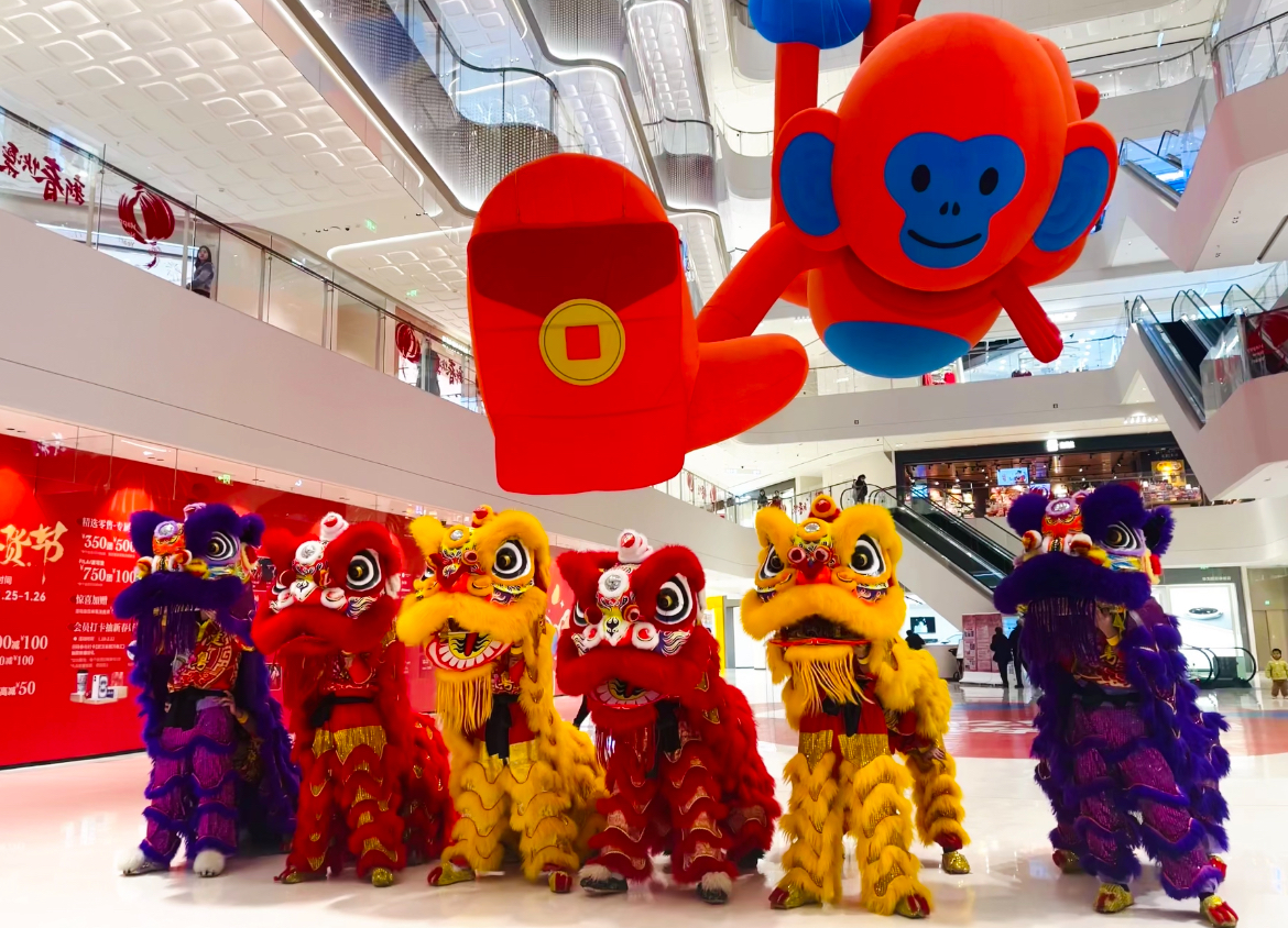 春节舞狮有迎祥纳福的寓意。走进商场,舞狮队伍穿梭于各个商户间,时而跳跃翻滚,时而眨眼卖萌,与正在逛商场的观众亲密互动,为新春佳节增添浓厚的喜庆氛围。商场内设置了不少互动装置,巨大的吉祥物金丝猴“hoho”下,市民争相打卡。