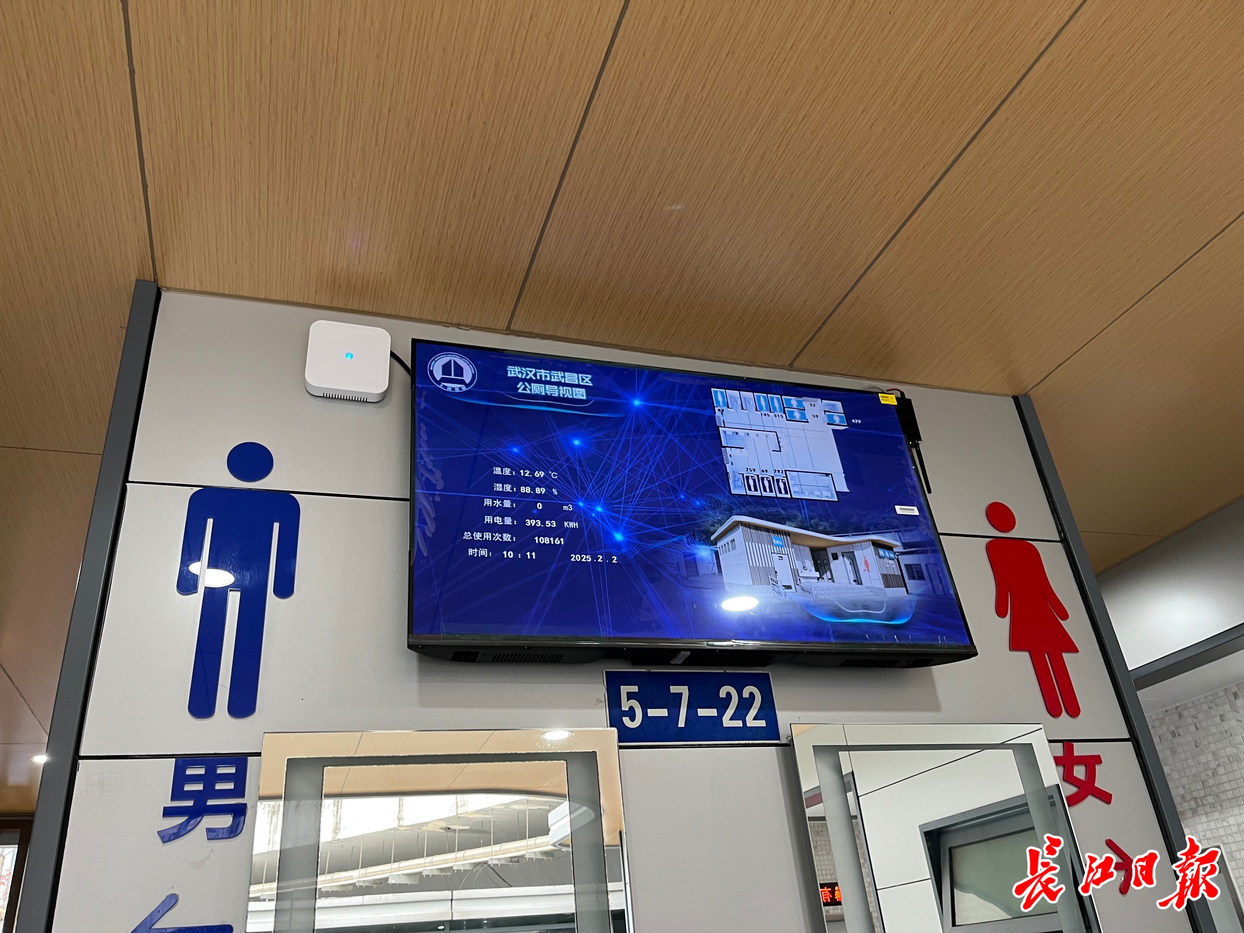 “温度12.69℃、湿度88.89%、使用次数108161次……”当日10时11分,长江日报记者在“智慧公厕”入口洗手台上的显示屏看到,公厕各项运行数据实时显示。步入公厕,这里科技感十足。只见每个厕间门上均安装飞字显示屏,显示厕间使用状态和如厕人员进入时间。一位保洁人员告诉记者,厕间提示系统采用了超声波人体感应设备,实时监控蹲位使用情况。“一旦有人占用厕间超过20分钟,监测系统便会在显示屏发出文字和语音提醒,我们会上前询问,既能确保使用者人身安全,又起到提醒指引作用,让厕间使用效率更高,也方便保洁人员即时打扫。”
