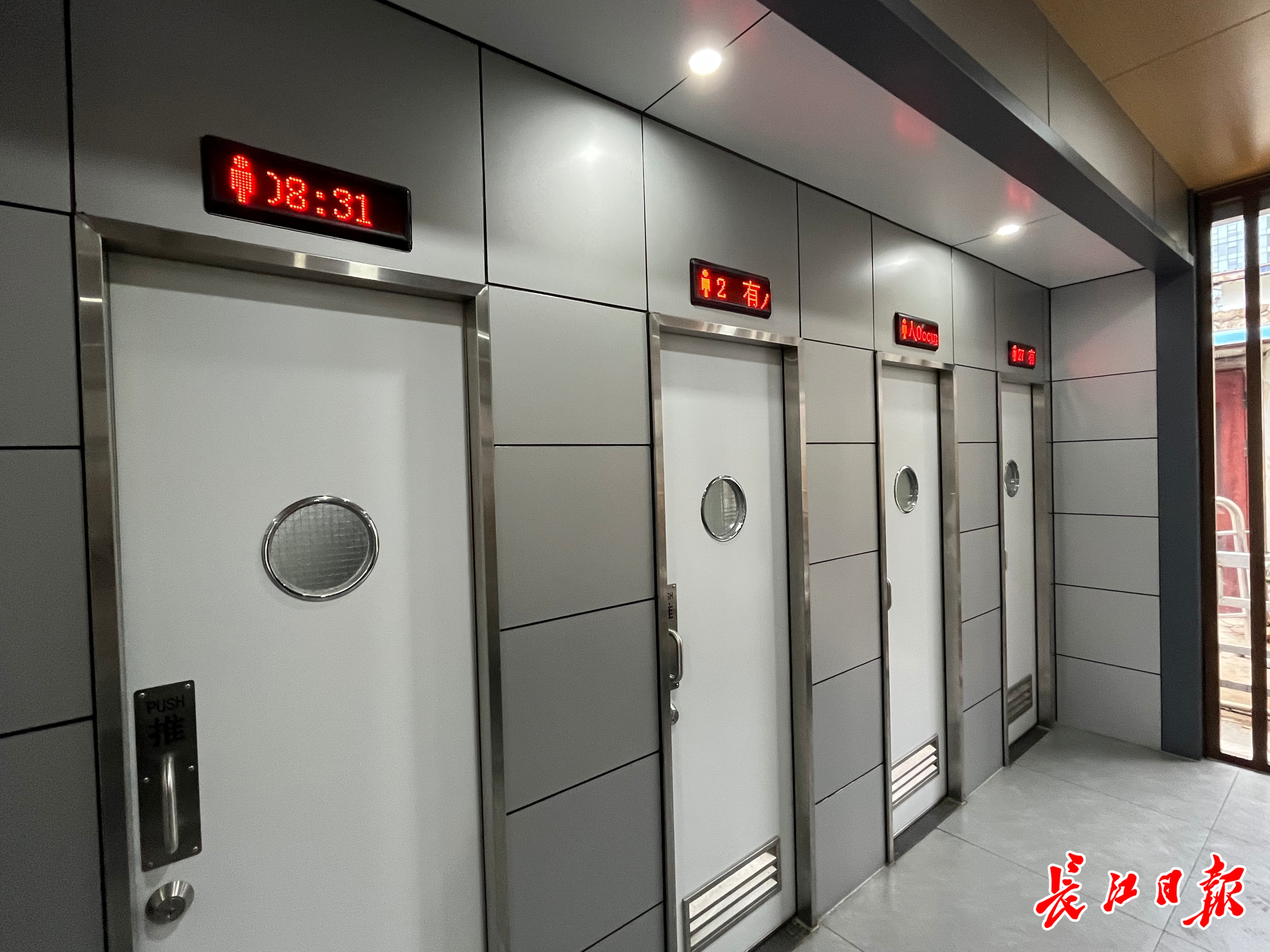 厕间门上安装飞字显示屏,显示厕间使用状态和如厕人员进入时间。 记者宋磊 摄