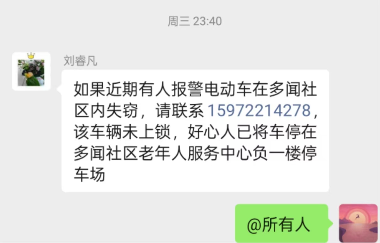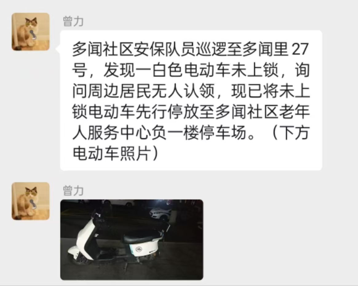1月27日,民警与各社区安保队员微信留言提醒,在多闻社区发现一辆未上锁的电动车。(微信截图)