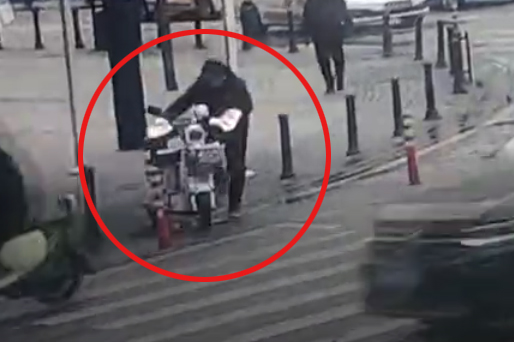 戴帽男子(红圈中)骑车经过捡走手机。(视频截图)