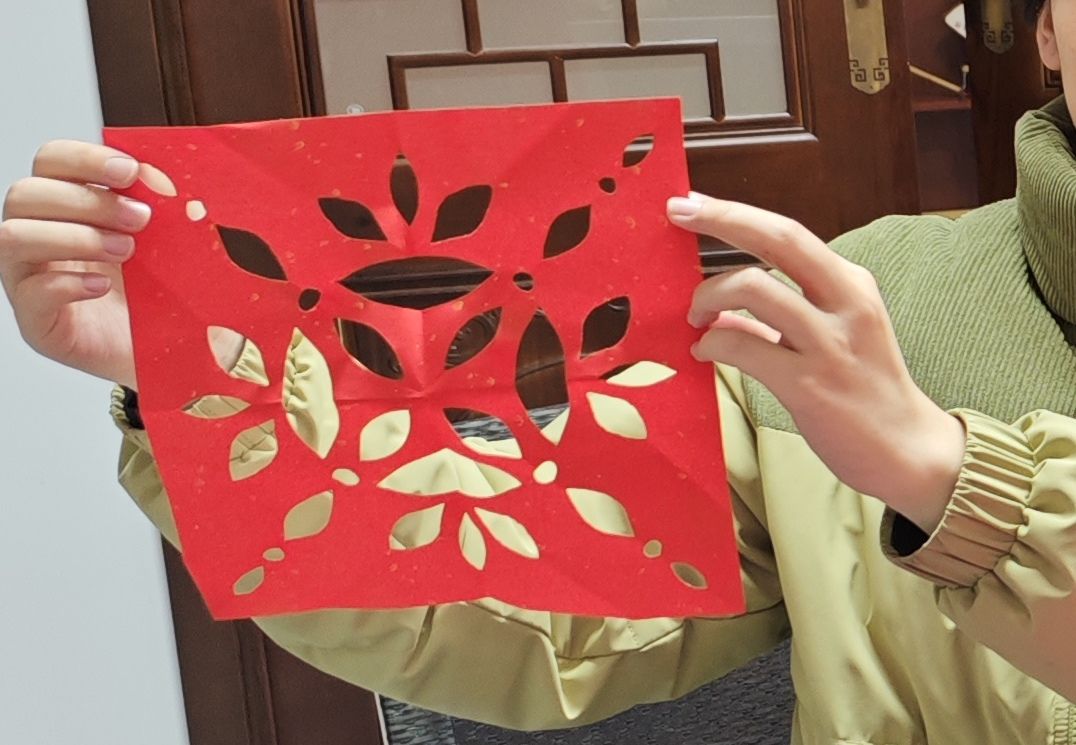 再次打开剪纸,一幅更加精致的绣球花窗花赫然展现在眼前。它不仅比刚才的样子更加精致,由记者自由发挥出的图案还巧妙组合成了4条金鱼的样子。