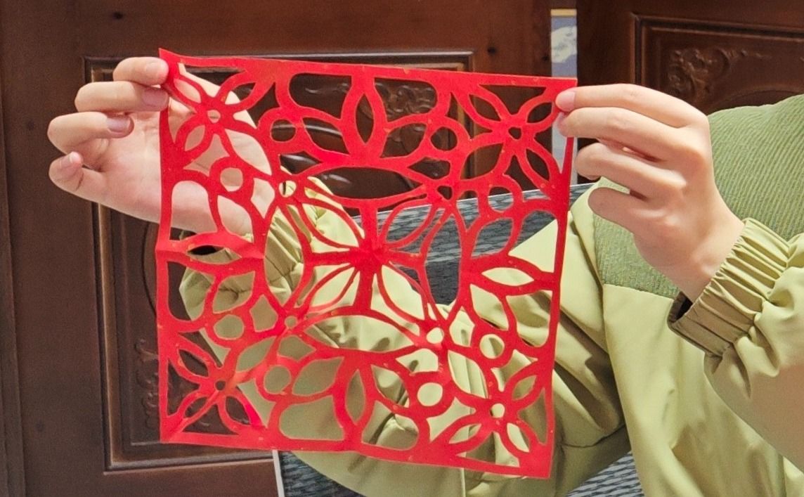 “不施画稿剪纸”是由彭艳华根据20多年剪纸经验总结出来的独特技艺。她递来一张正方形的红纸,说:“想要知道‘不施画稿剪纸’是怎么做到的,试一下最有用。”