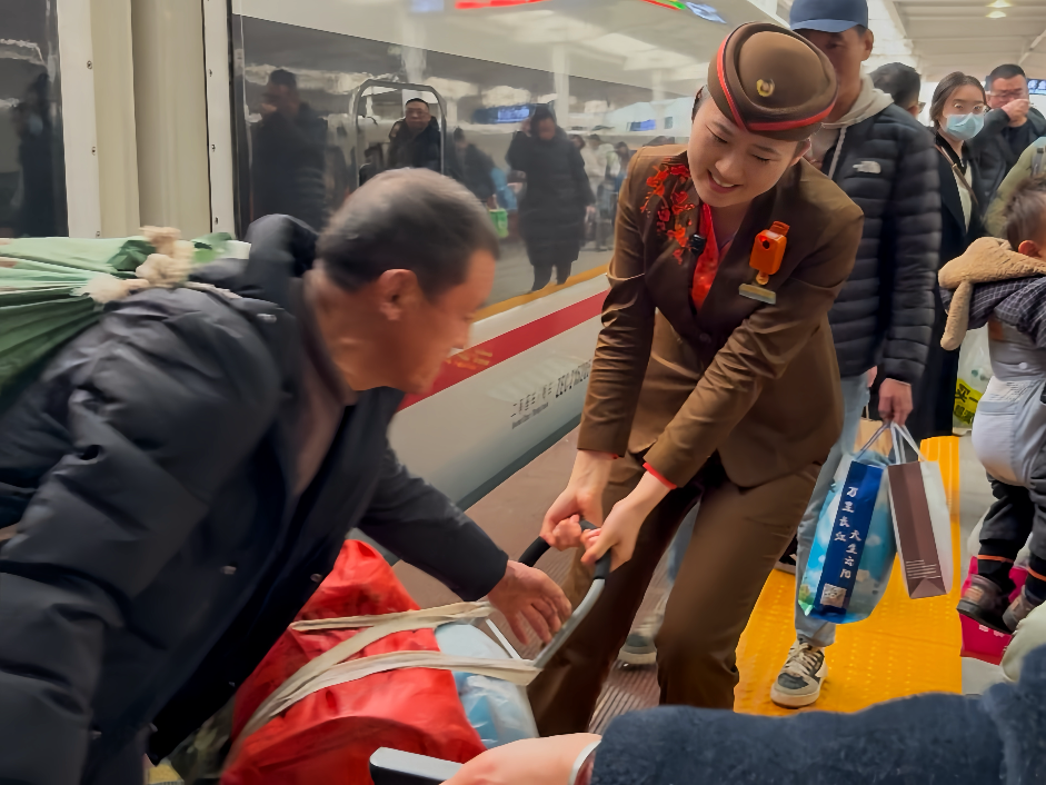 汉口动车组车间乘务员荣凯悦帮助乘客搬运行李。通讯员雷诗妍摄