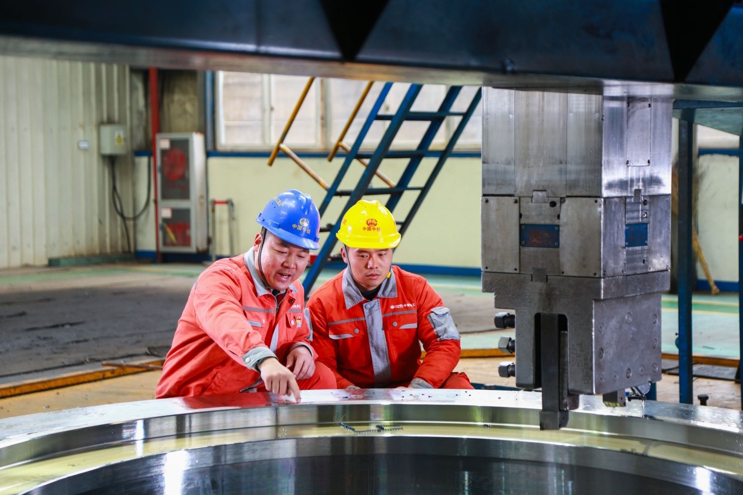 班组已经开工两天,三班倒不停工。叮嘱工友继续关注设备情况,陈汉龙起身去看图纸。经过反复翻动的图纸已经有些卷边,搓了搓沾上油污的手掌,陈汉龙将其放在工具台上,俯身查看数据。