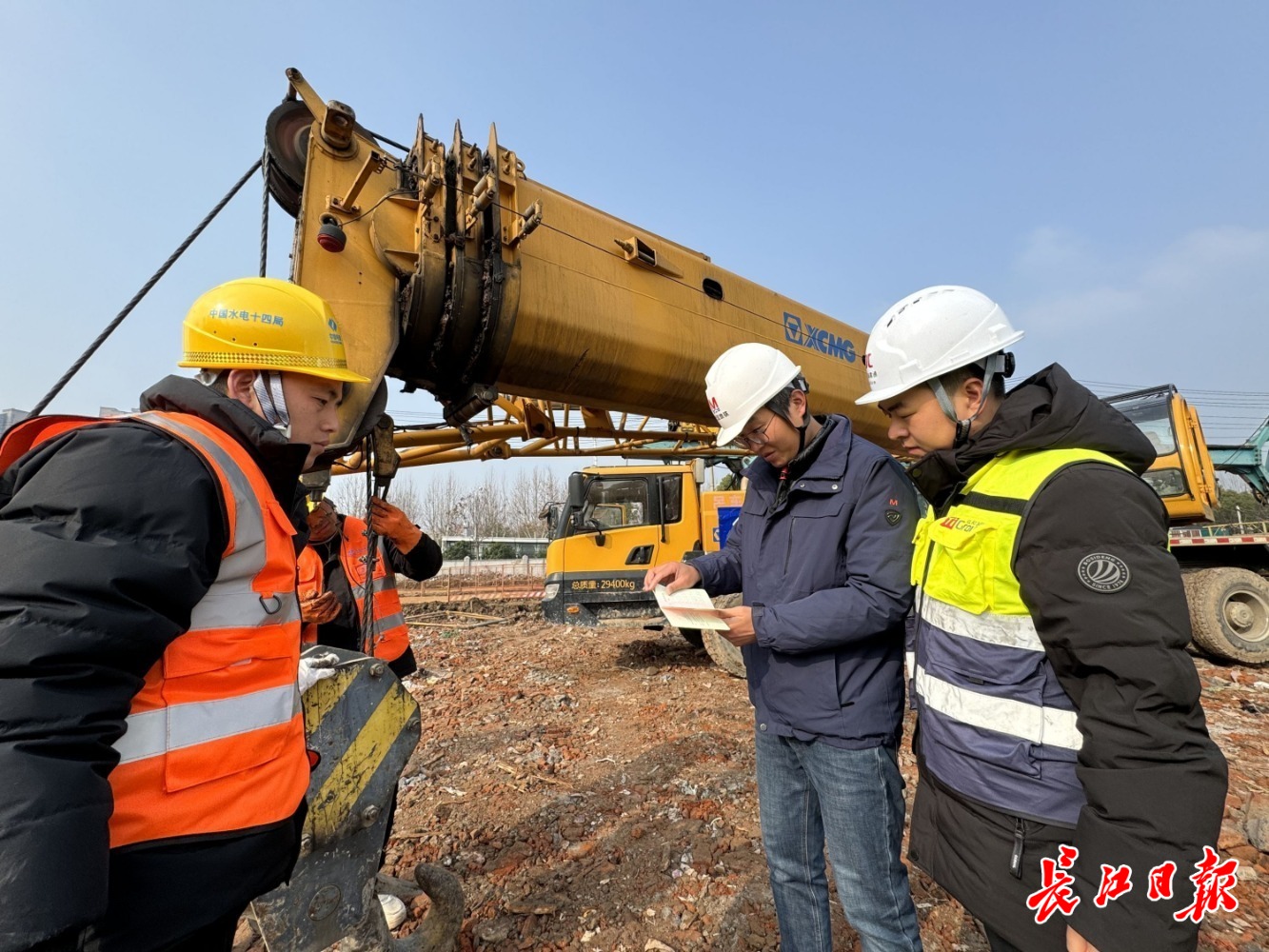 2月4日,地铁业主代表祝雄威(右二)检查起重吊车操作人员证件。记者陶常宁 摄