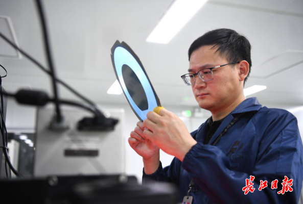 华工激光半导体产品线总监黄伟在实验室检查硅晶圆。 记者高勇 摄
