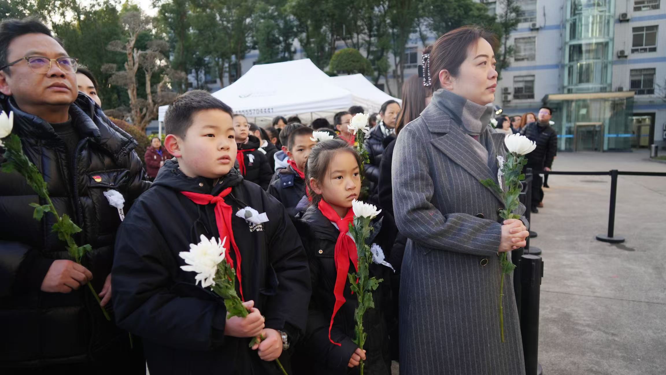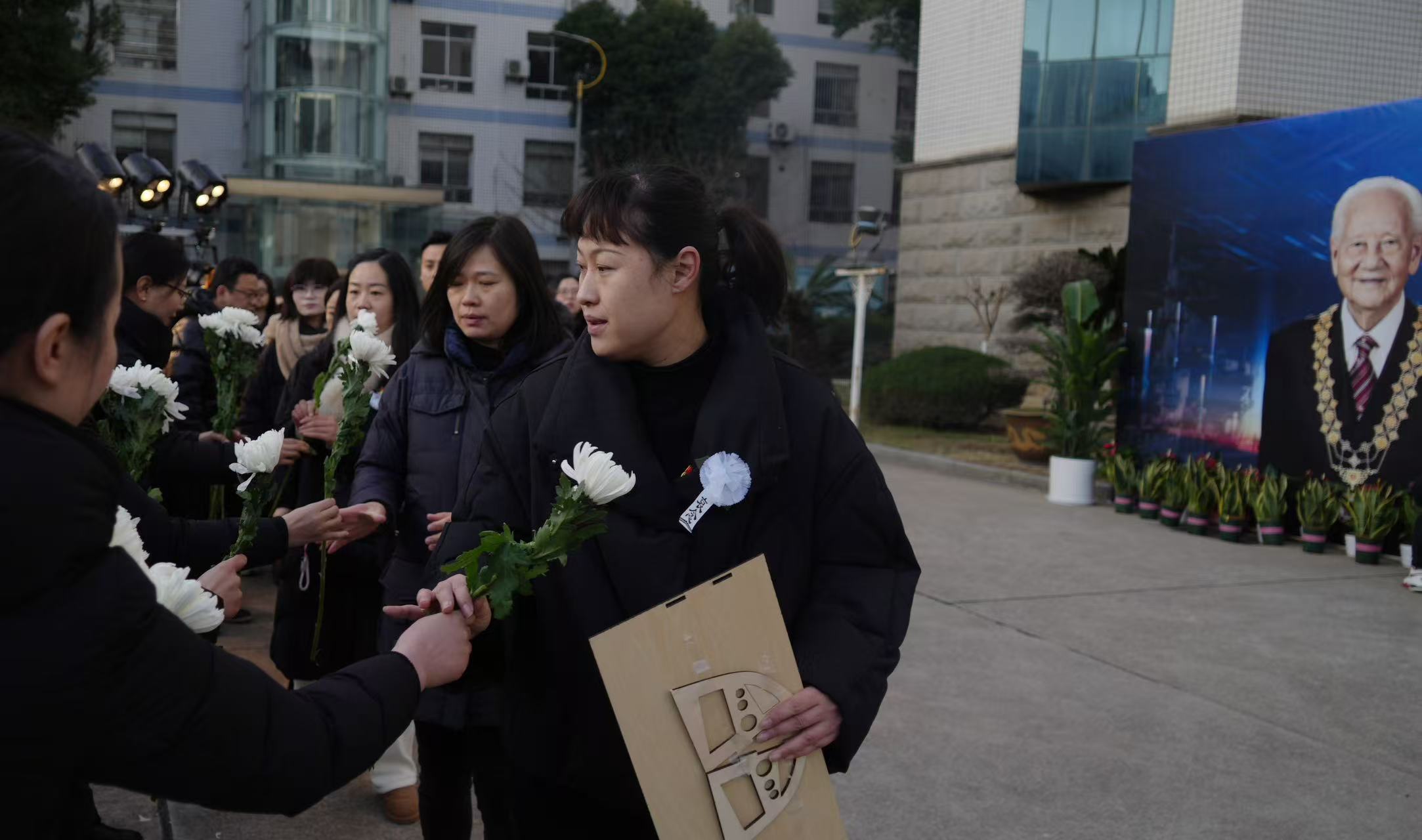 早上8点,武昌区中山路小学师生、家长代表100多人,来到七一九研究所参加悼念活动。孩子们身着深色外衣,佩戴红领巾,手拿白花,向黄旭华的照片三鞠躬。