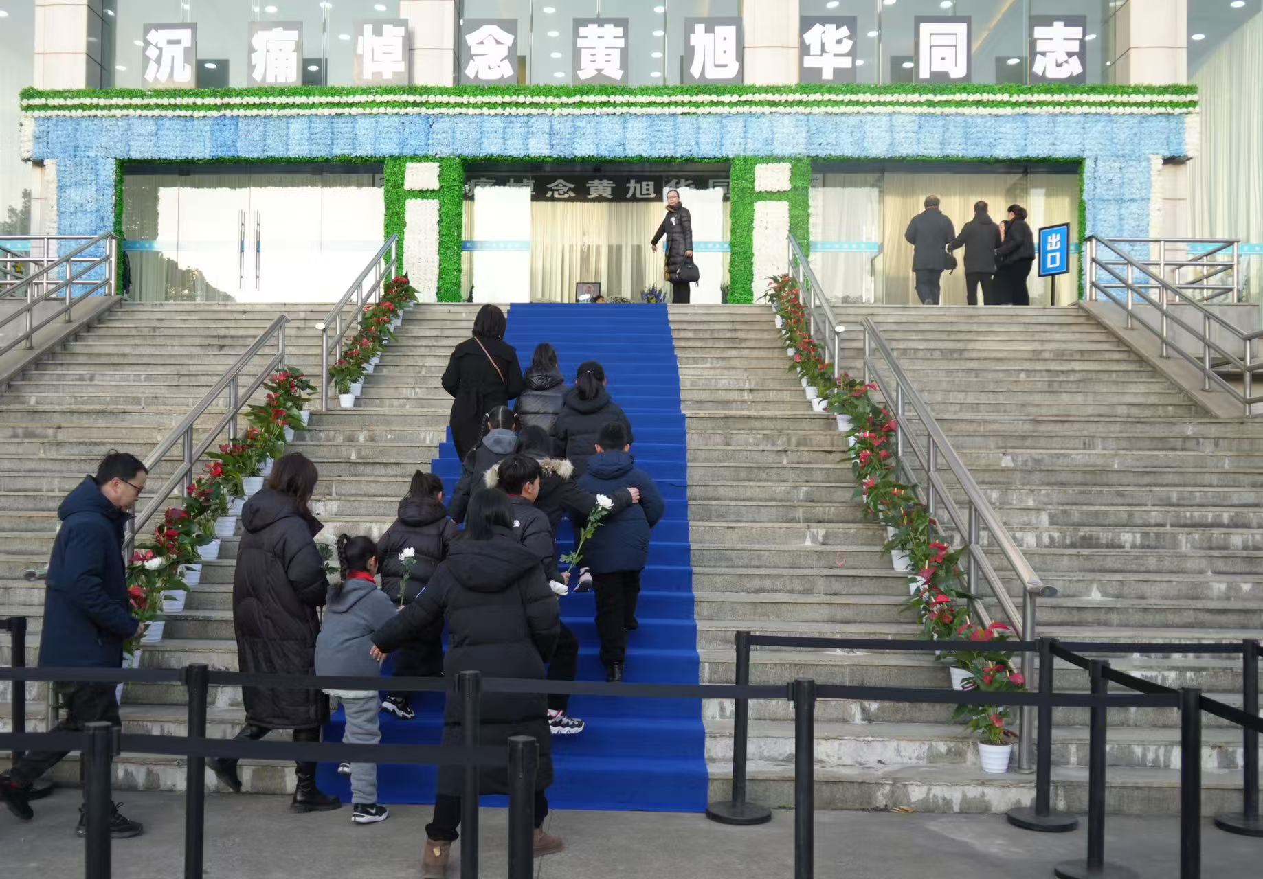 2月8日,黄旭华生前所在单位、中国船舶重工集团公司第七一九研究所内气氛庄重。办公大楼前悬挂着“沉痛悼念黄旭华同志”黑底白字。现场摆放着黄旭华的照片,照片前用鲜花摆成潜艇和海浪的形状。