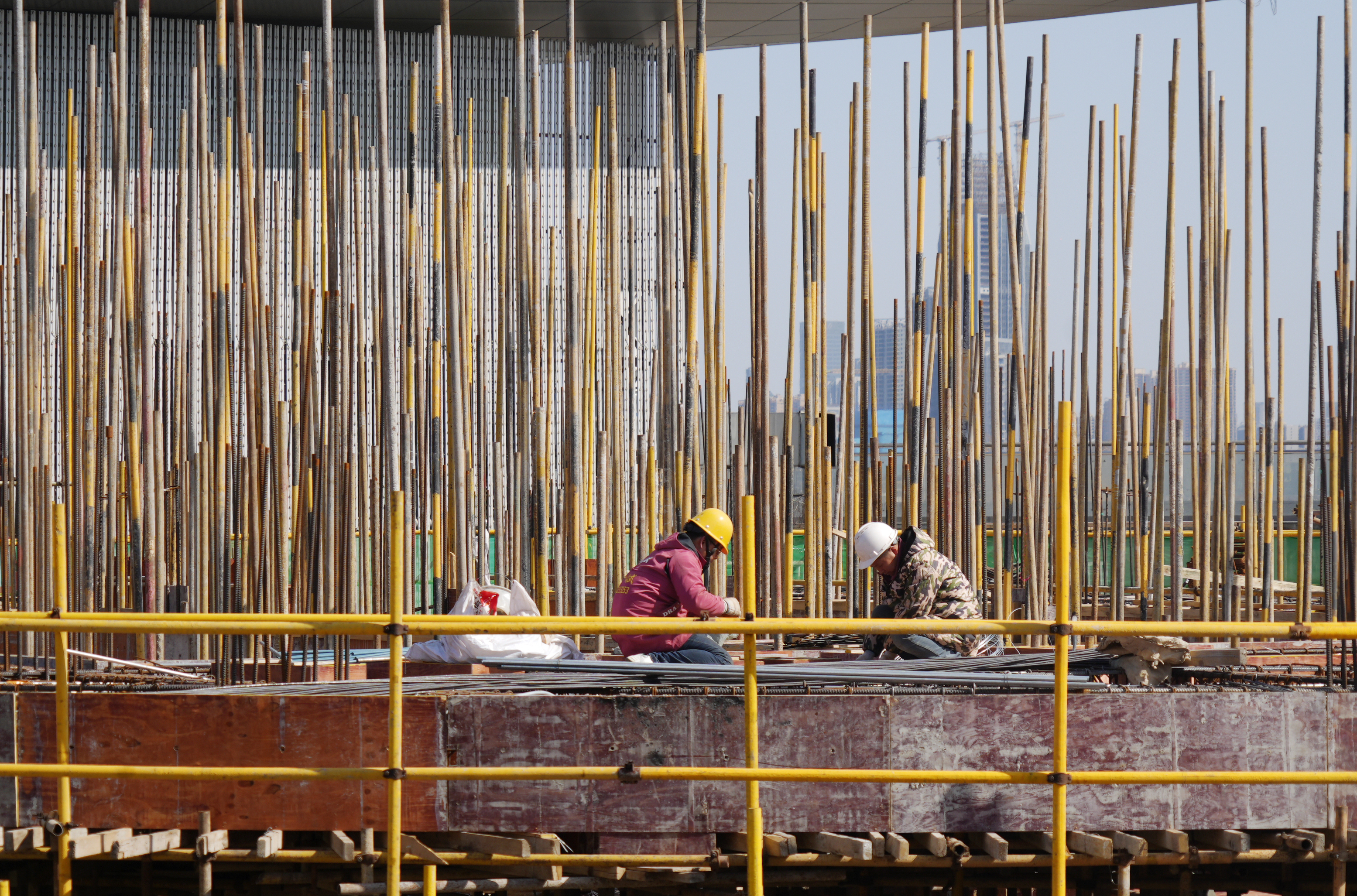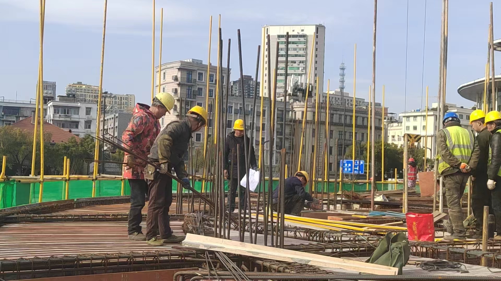 2月8日上午9点,记者在施工现场看到,武汉关泵站的结构雏形已经出现,高约5米的脚手架已经搭建完毕,现场一片热闹的施工场景。30多名钢筋工人正忙碌地穿梭在钢筋丛林中。工人们熟练地拿起扎丝,将两根钢筋交叉处紧紧地缠绕起来。扎丝在他们手中飞快地转动,发出“嗖嗖”的声音。
