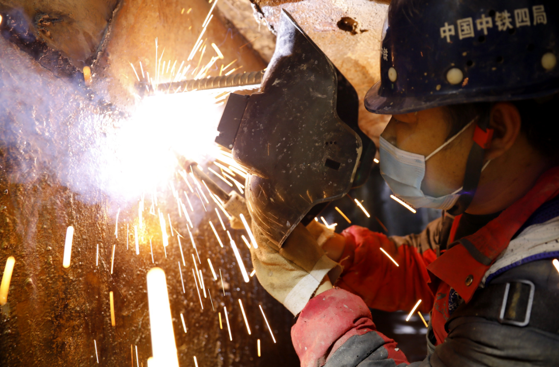 施工人员焊接洞门钢板。通讯员袁永华 摄